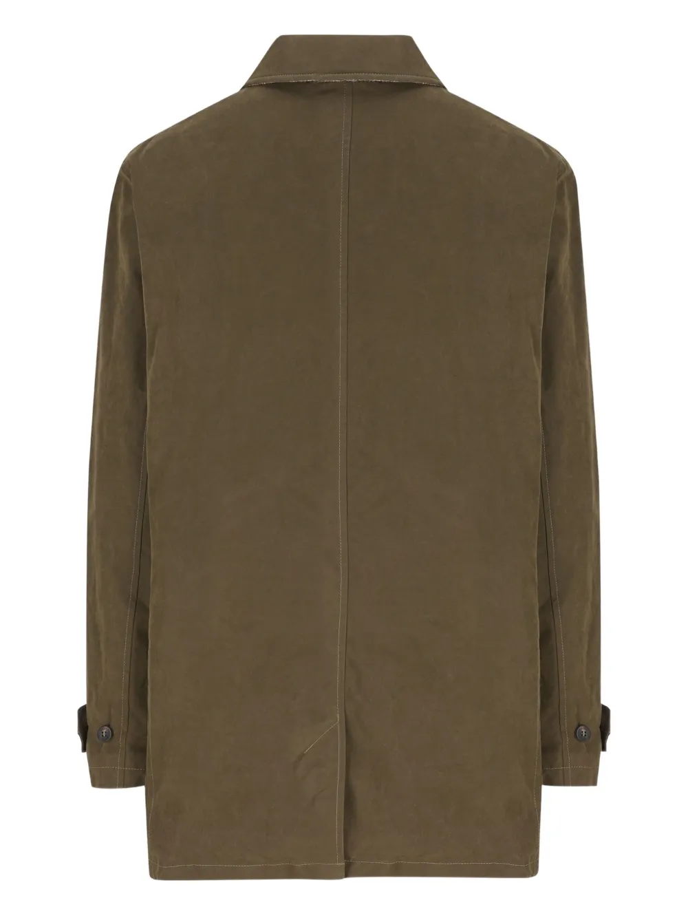 Оливково-зеленый цвет, воротник-стойка, потайная передняя застежка, прорезные карманы, длинные рукава, манжеты на пуговицах