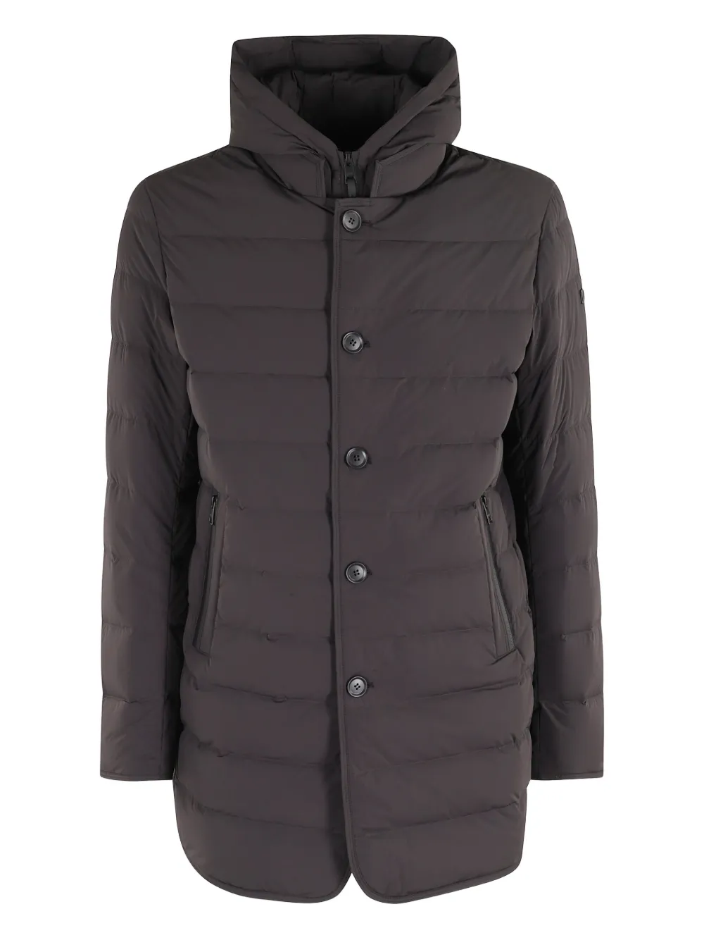 Темно-коричневый, застежка на пуговицы спереди, передние карманы на молнии, капюшон