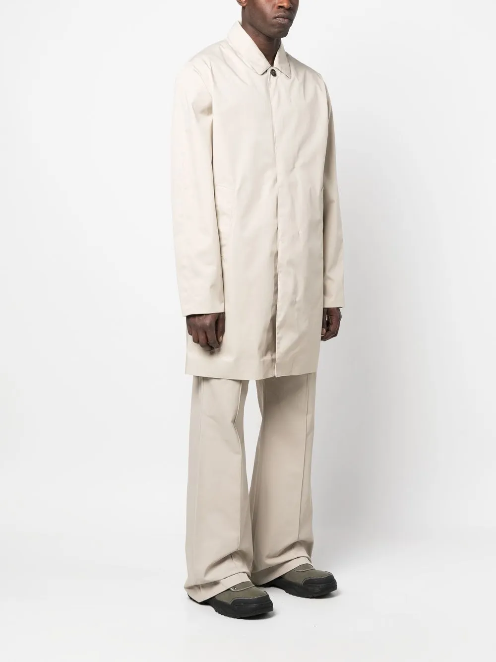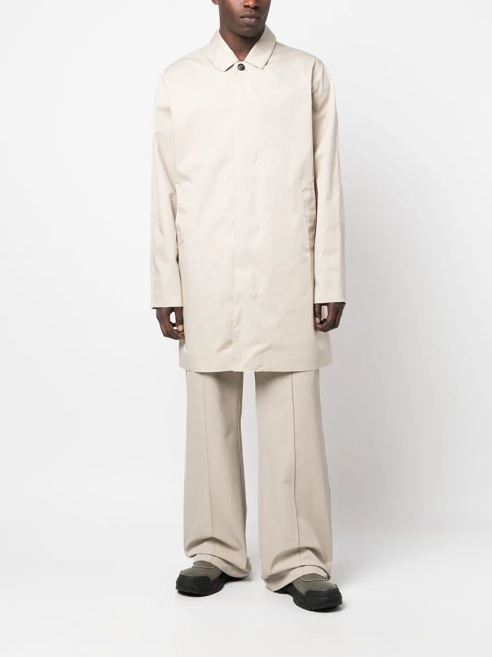 Светло-бежевый, смесовый хлопок, отложной воротник, застежка на пуговицах спереди, потайная застежка спереди, длинные рукава и два прорезных кармана по бокам.