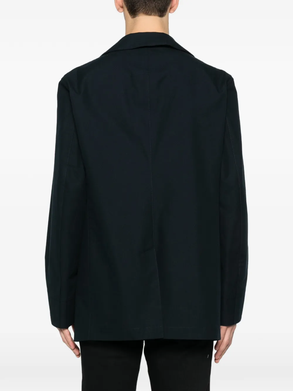 Темно-синяя хлопковая двубортная модель с клапанами на карманах, застежкой на пуговицы и классическим воротником