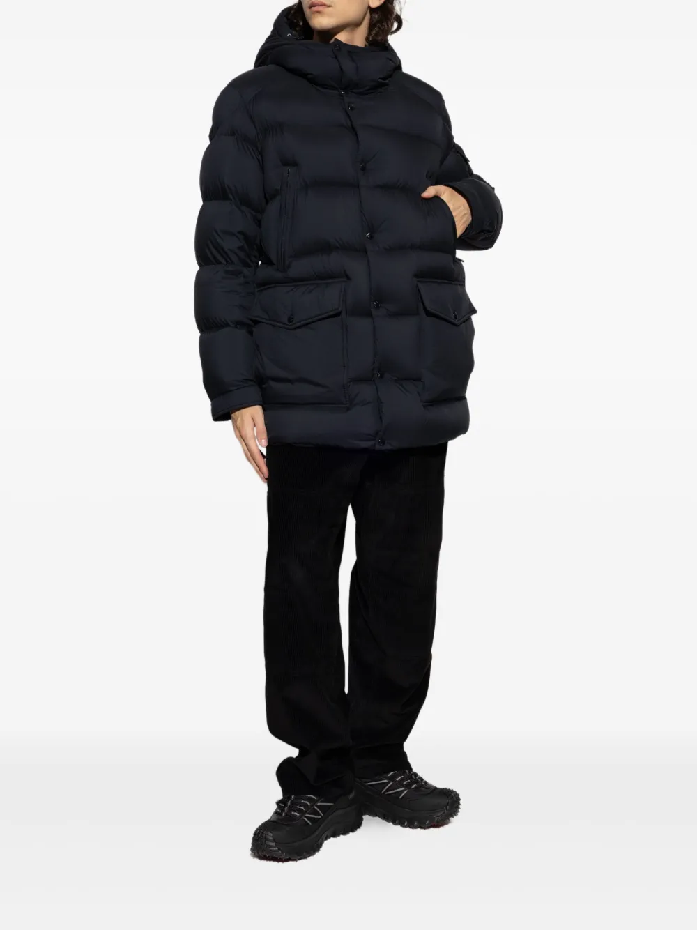 Темно-синяя куртка с капюшоном, застежкой на кнопки, накладными карманами и нашивкой с логотипом