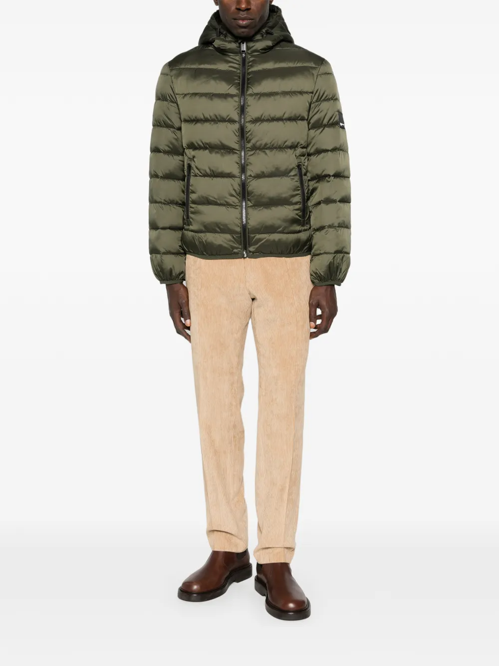 Темно-зеленый пуховик с нашивкой-логотипом, застежкой-молнией на капюшоне, боковыми карманами на молнии, в стиле "пуховик"