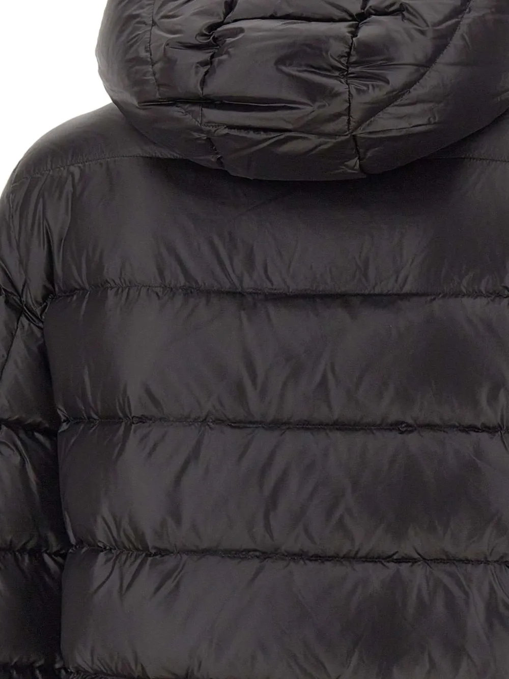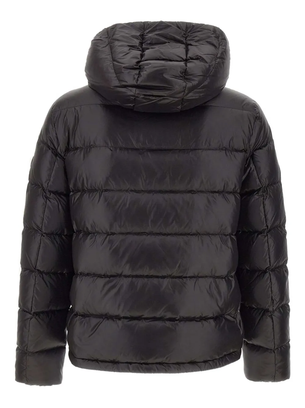 Черный стеганый дизайн, несъемный капюшон, застежка-молния, боковые карманы, нашивка с логотипом на рукаве