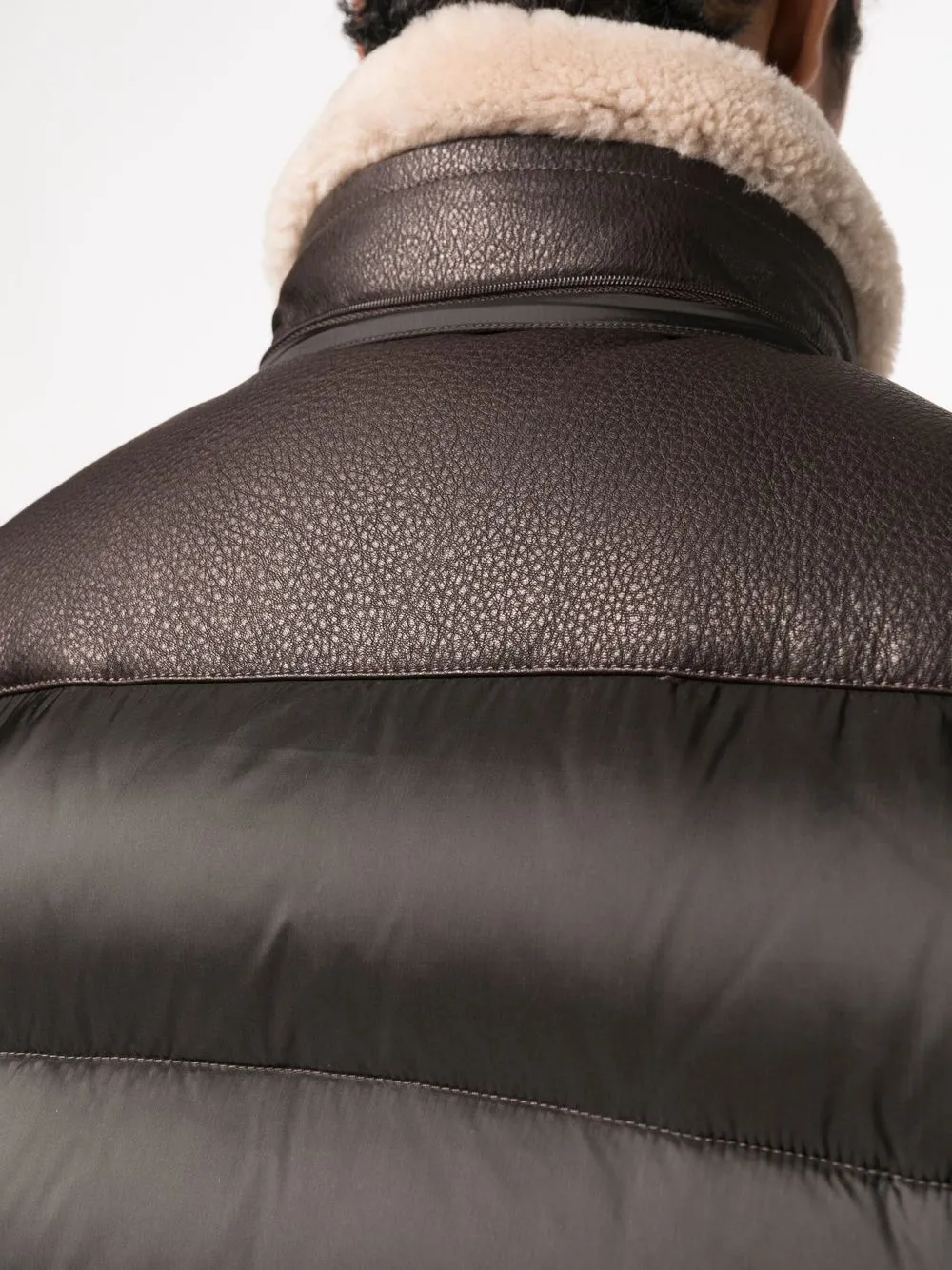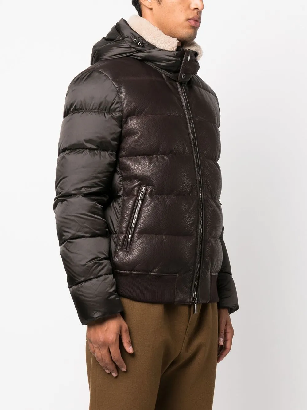 Кофейный, кожа, вставки, дутый материал, наполнитель из смеси пуха и пера, стеганая отделка, затягивающийся на шнурок капюшон, отделка из искусственного меха, высокий воротник, застежка с пряжкой спереди, застежка на молнии спереди, длинные рукава, два кармана на молнии по бокам и подол в рубчик.