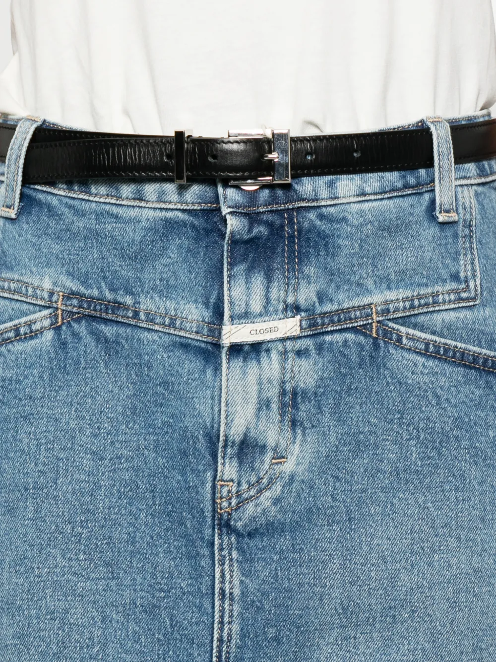 Синяя юбка А-силуэта, передние накладные карманы, разрез спереди, шлевки для ремня