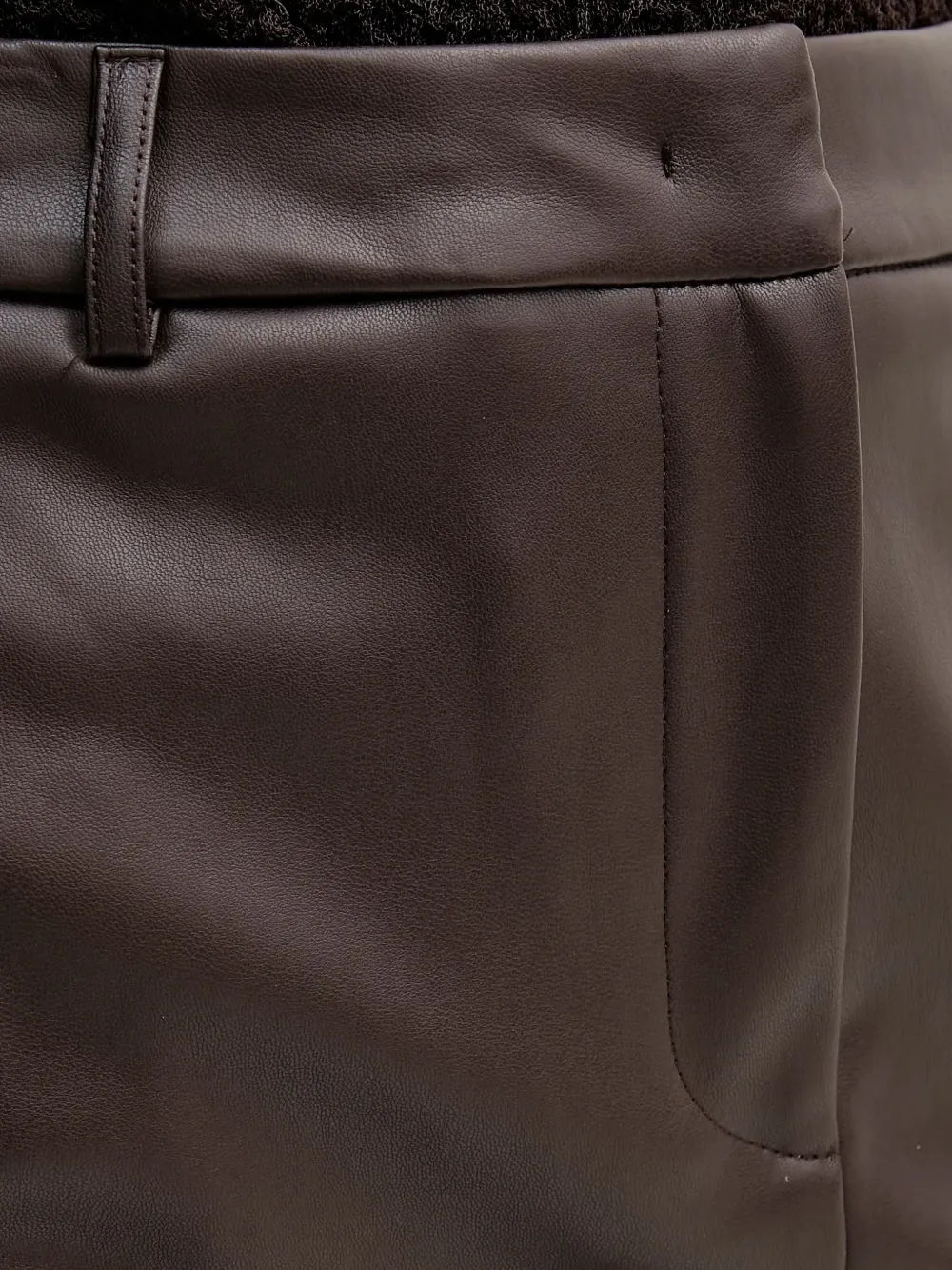 Коричневый ремень, шлевки, фронтальный разрез, боковые карманы в швах, тональная строчка