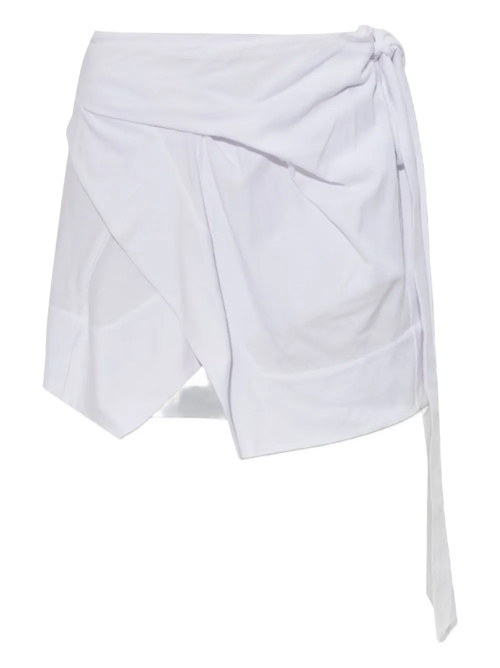 Белое платье с запахом, боковой завязкой, асимметричным подолом, драпировкой и мини-длиной