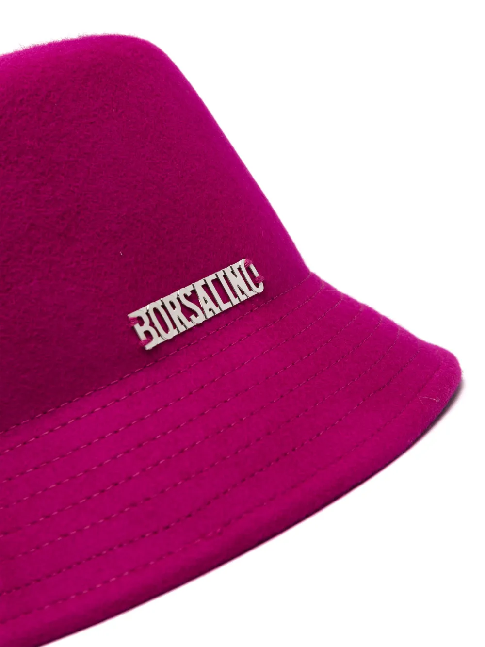 Темно-розовый, шерсть, трикотажный материал, матовый эффект, серебристый металлический логотип и узкие поля.