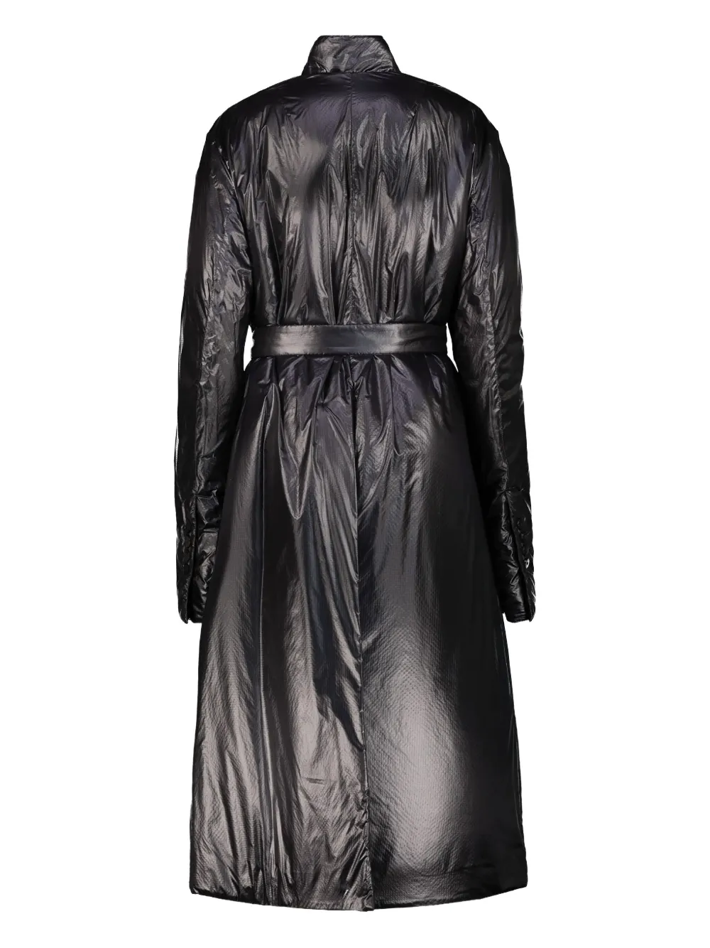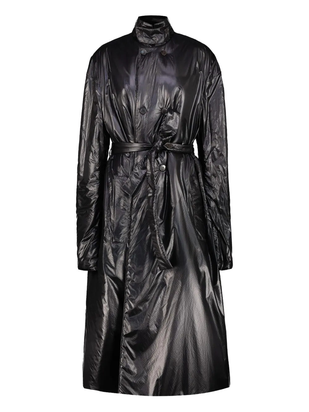 Черный рипстоп, текстурированный материал, пояс на талии, двубортная застежка на пуговицы, накладные карманы спереди, высокий воротник, длинные рукава