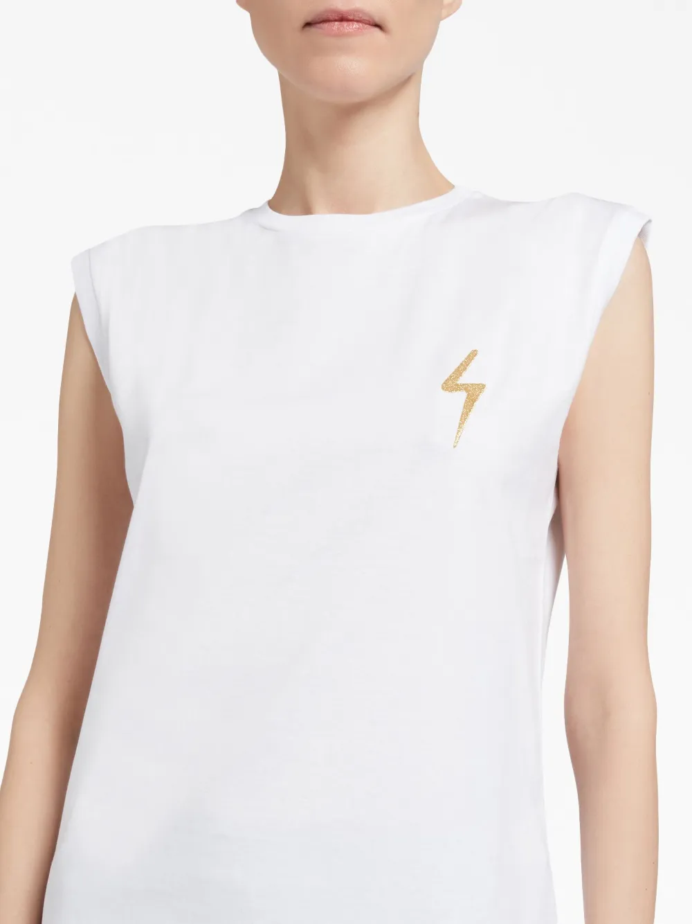 Белый, горчично-желтый, хлопок, вышитый логотип на груди, вышитый логотип сзади, круглый вырез, без рукавов и закругленный подол.