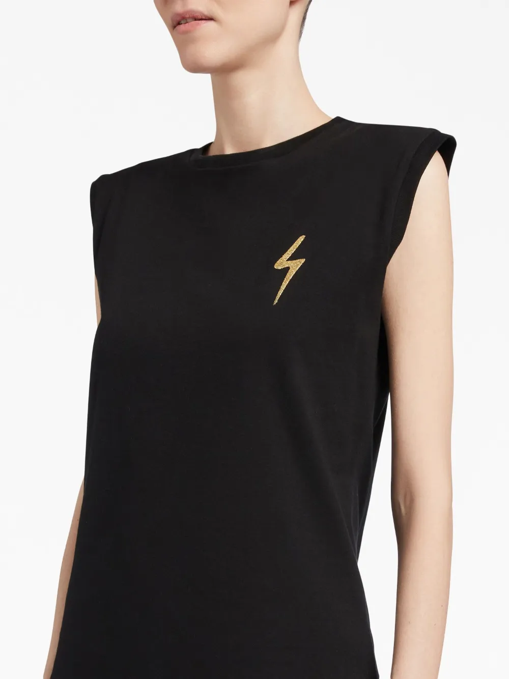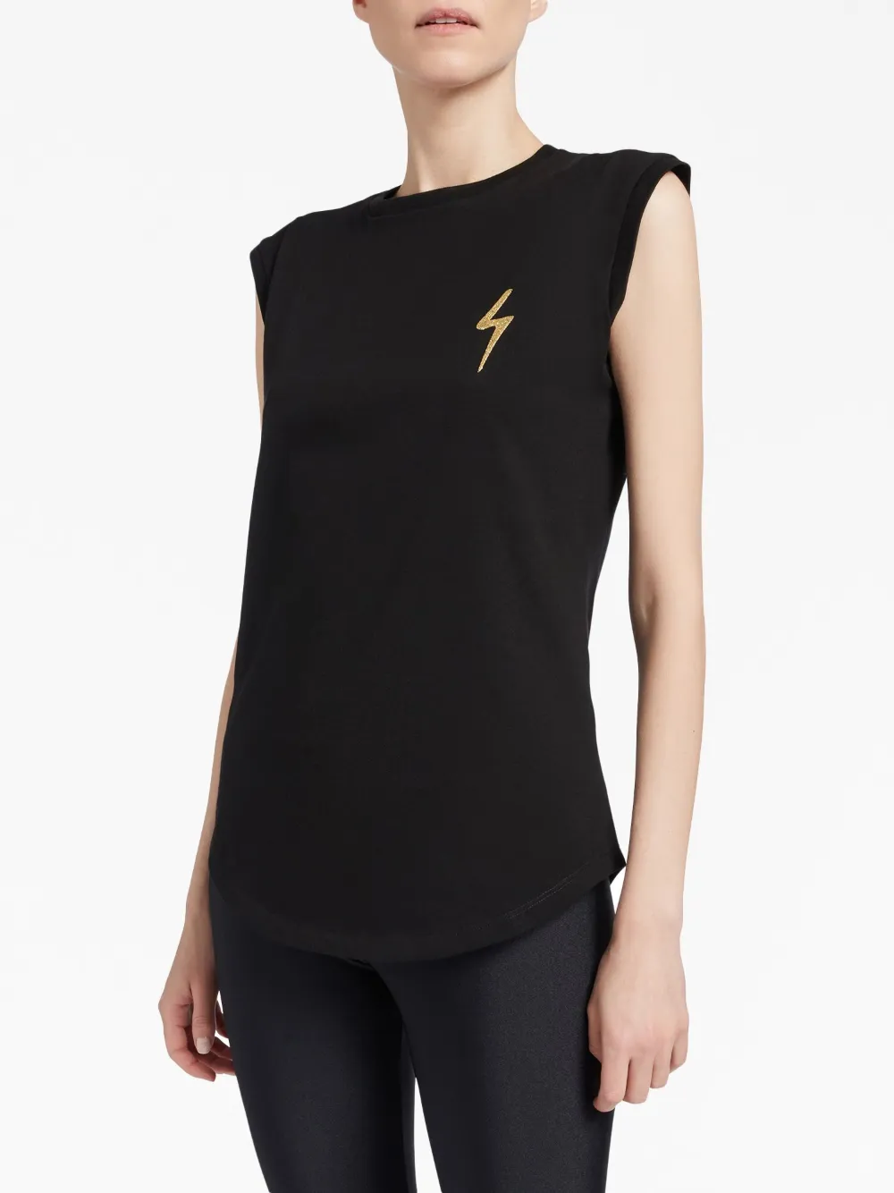 Черный, хлопок, вышитый логотип сзади, вышитый узор, круглый вырез, без рукавов и закругленный подол.