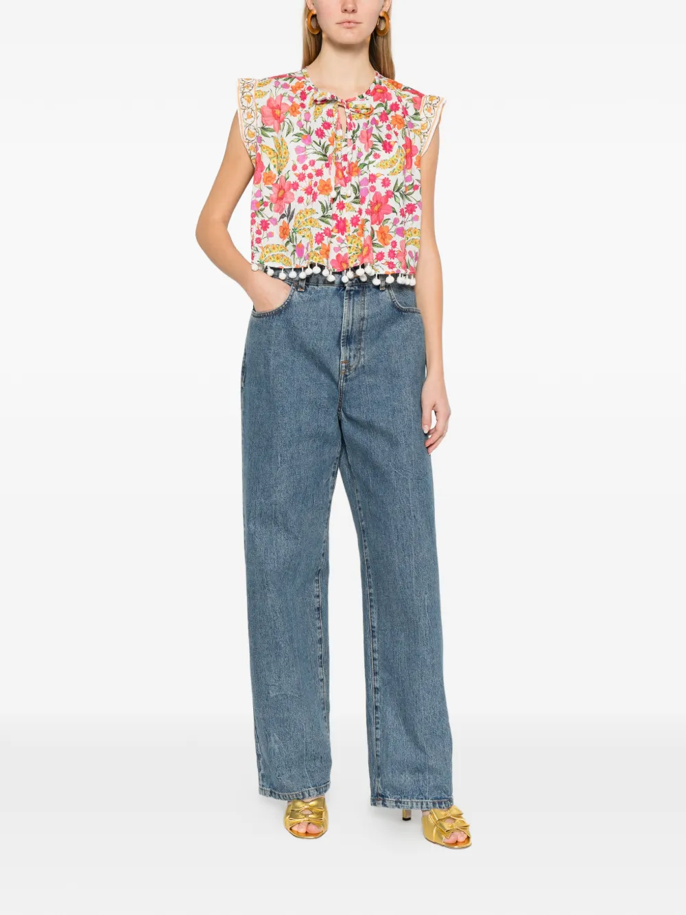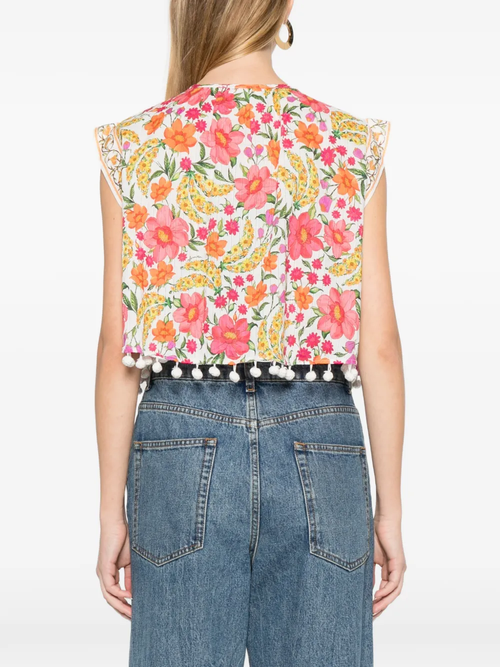 Белый топ без рукавов с цветочным принтом, отделкой помпонами и завязками