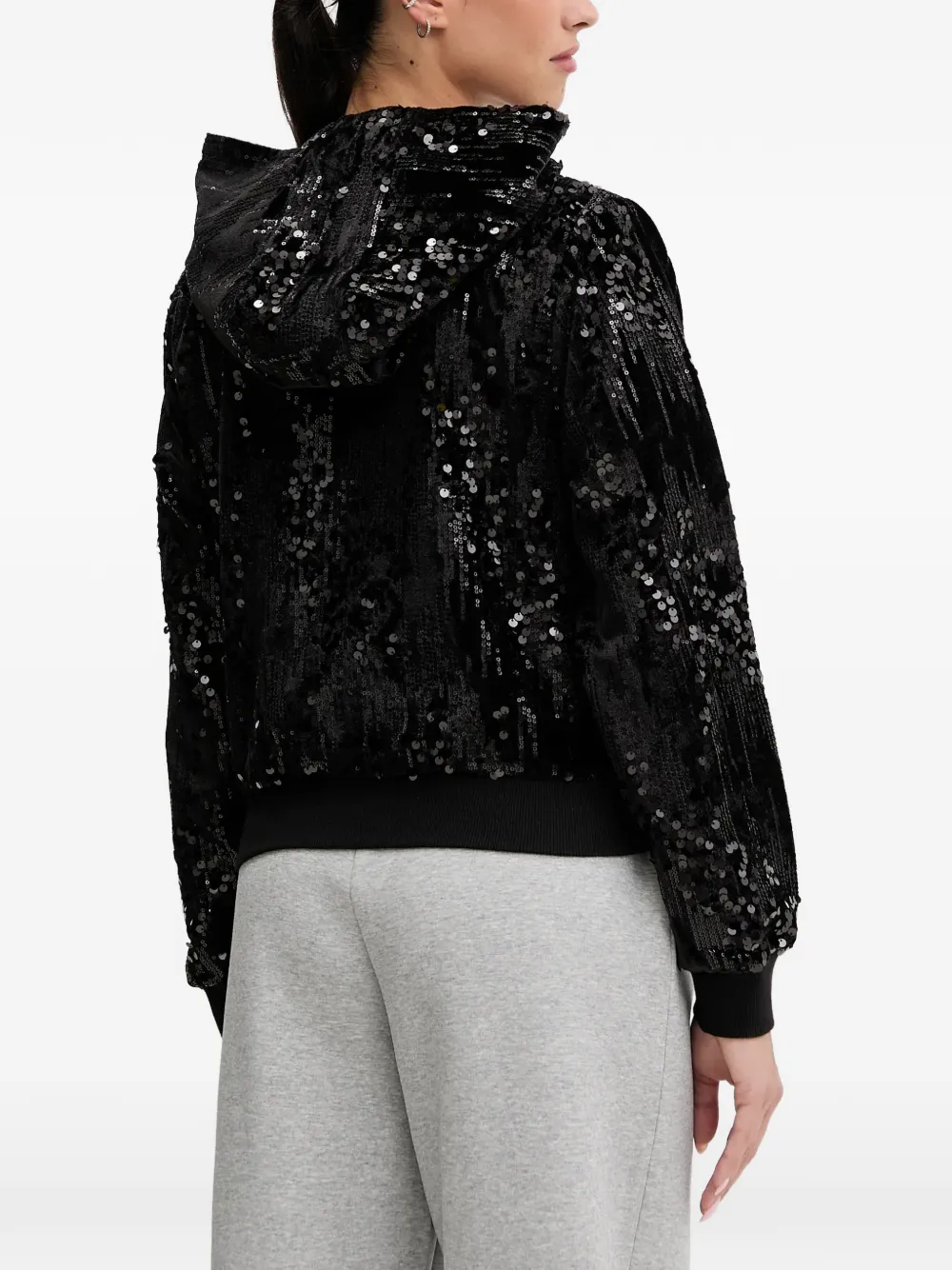 Черный с пайетками, застежка-молния, капюшон, длинные рукава, ребристый низ