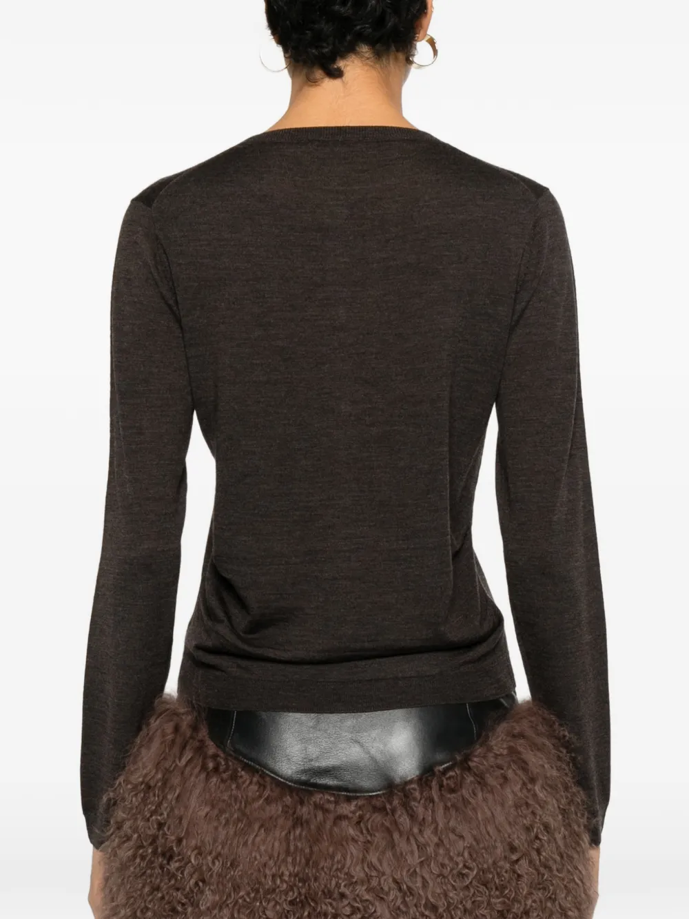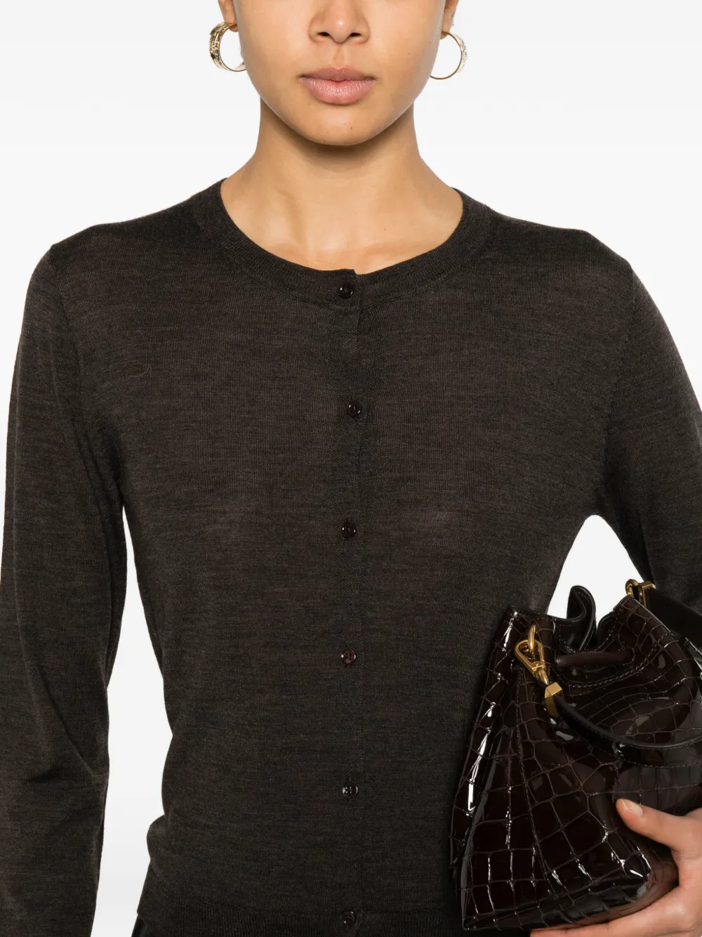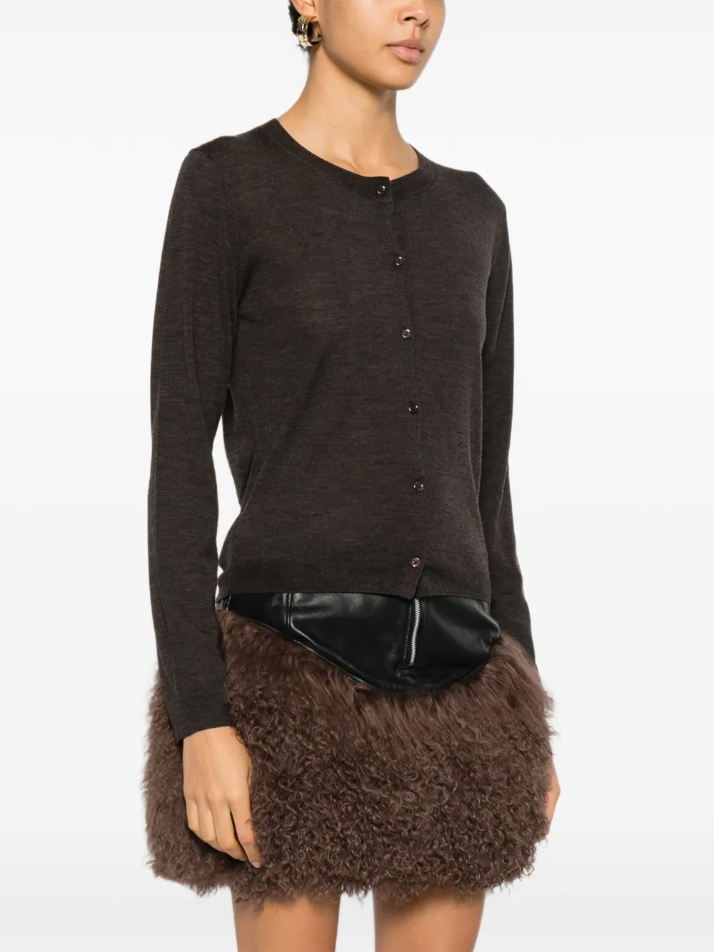 Коричневый свитер с круглым вырезом, длинными рукавами, застежкой на пуговицы, ребристыми отделками и прямым подолом