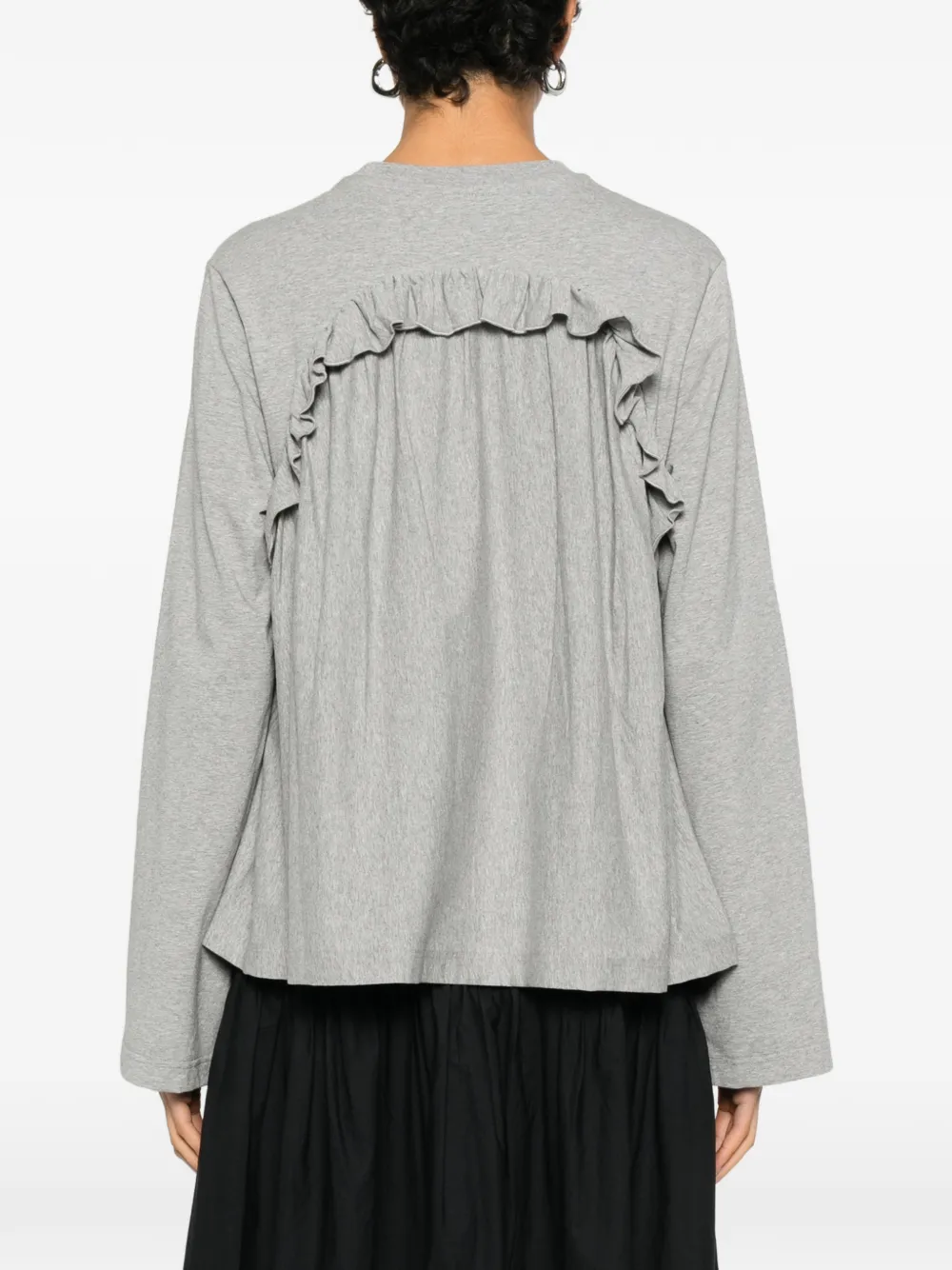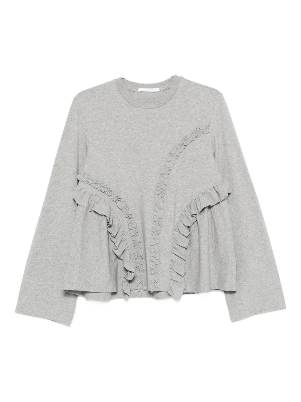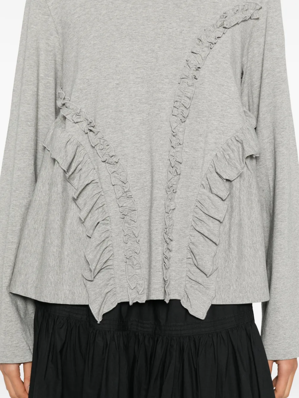 Серый топ с оборками, круглым вырезом, длинными рукавами и расклешенным подолом