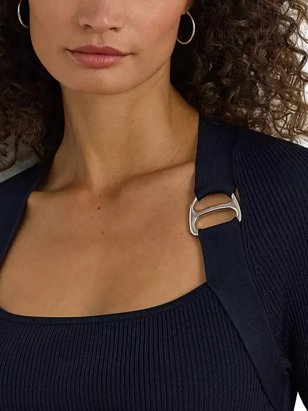 Синий в рубчик, трикотаж, квадратный вырез, длинные рукава, деталировка с пряжкой