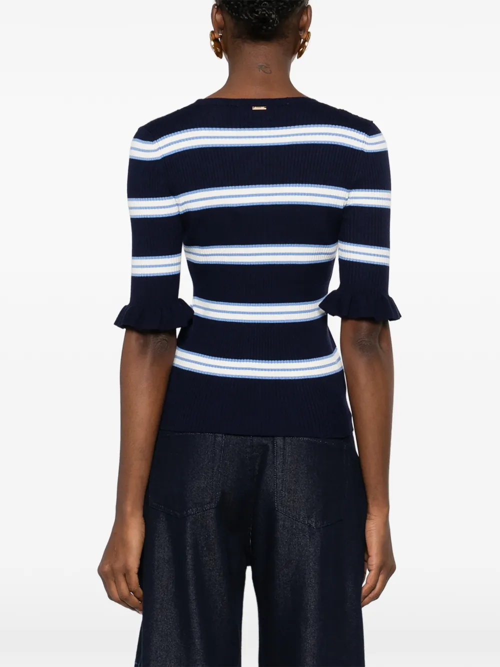 Голубая и белая рубашка в полоску с V-образным вырезом, рукавами до локтя и оборками на манжетах