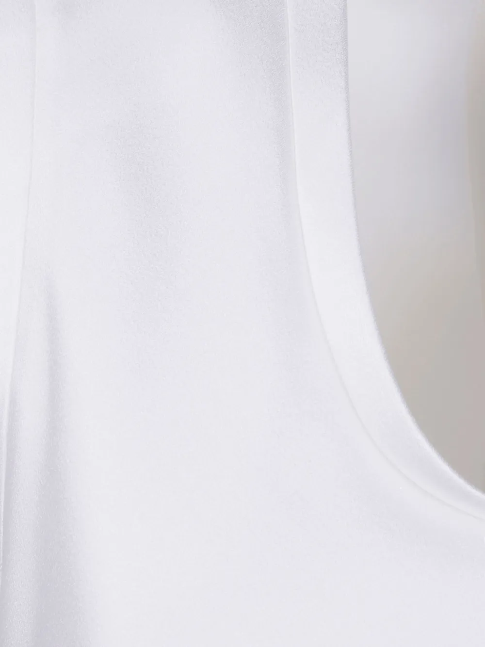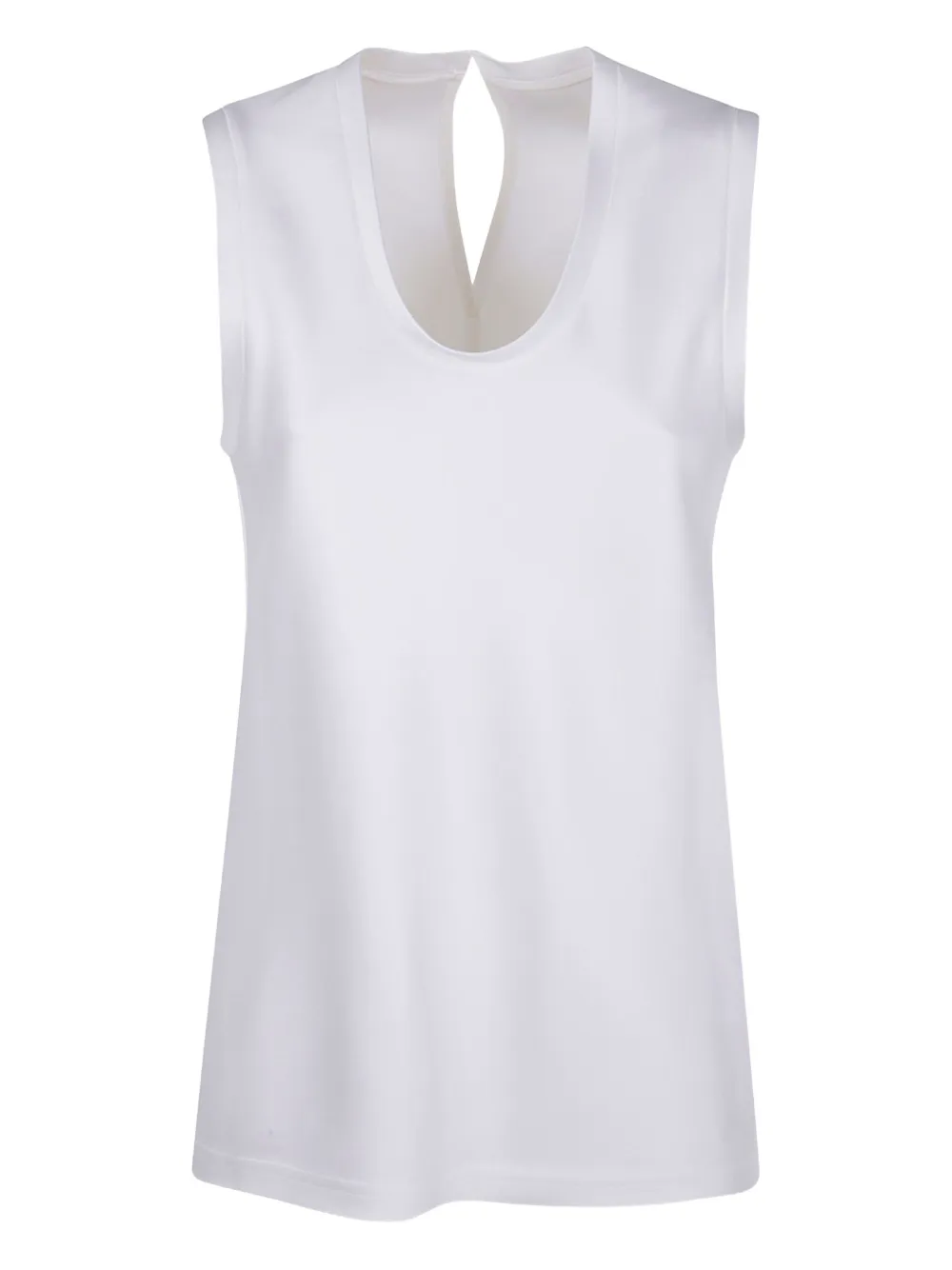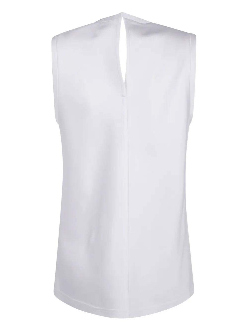 Белый топ с круглым вырезом, без рукавов, открытой спиной и застежкой на пуговицу сзади