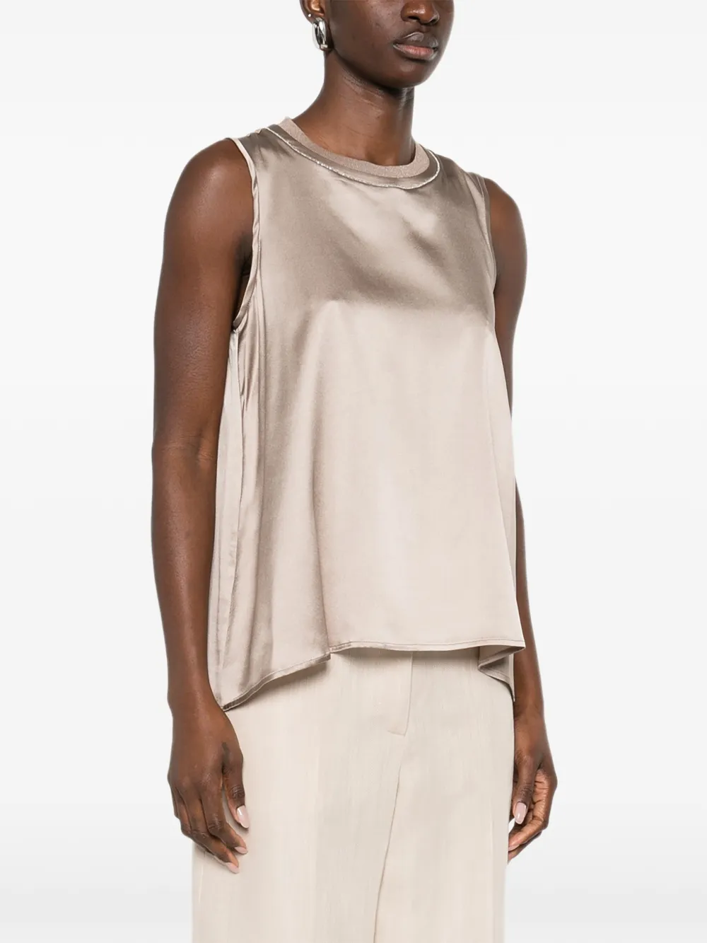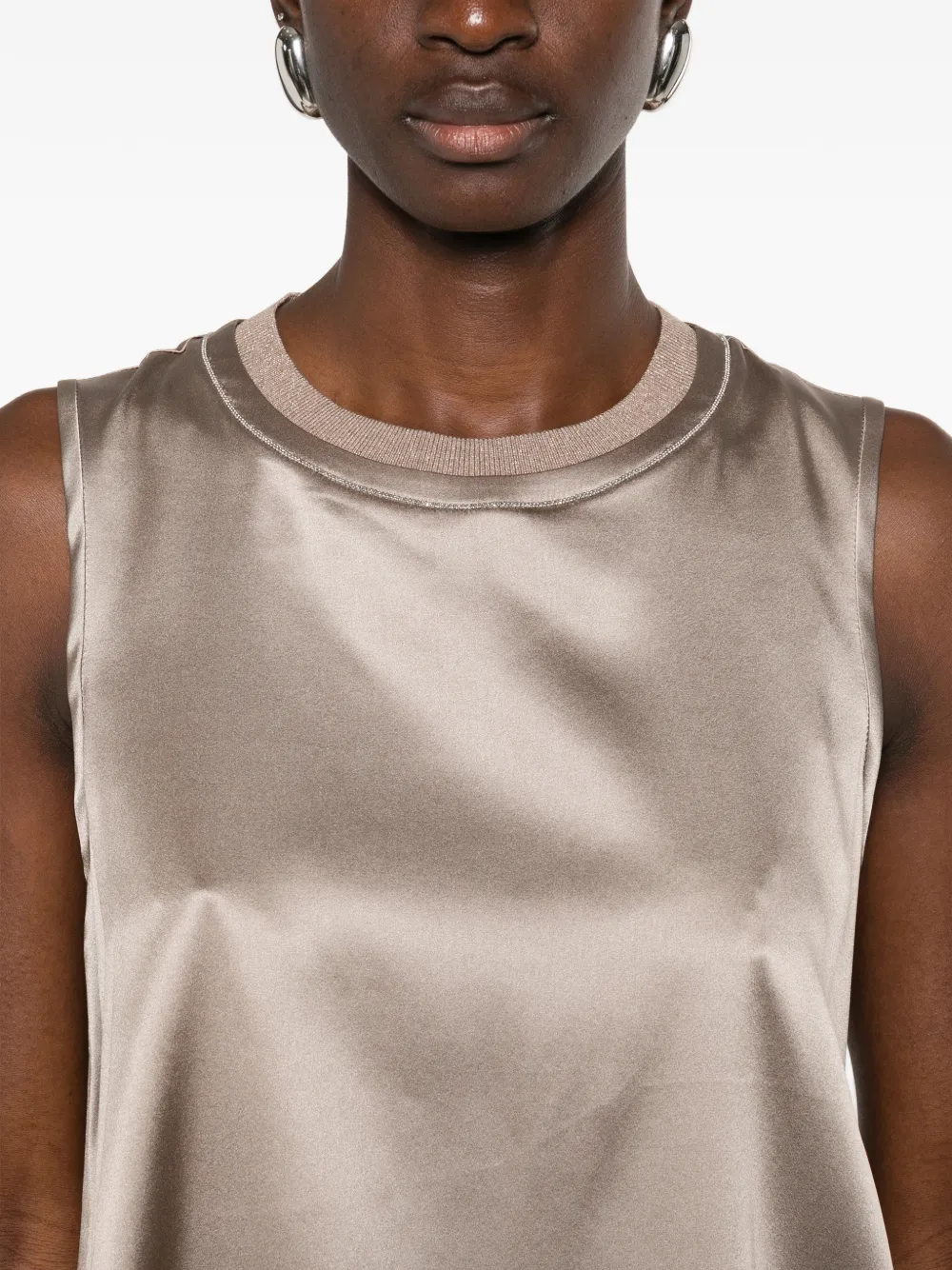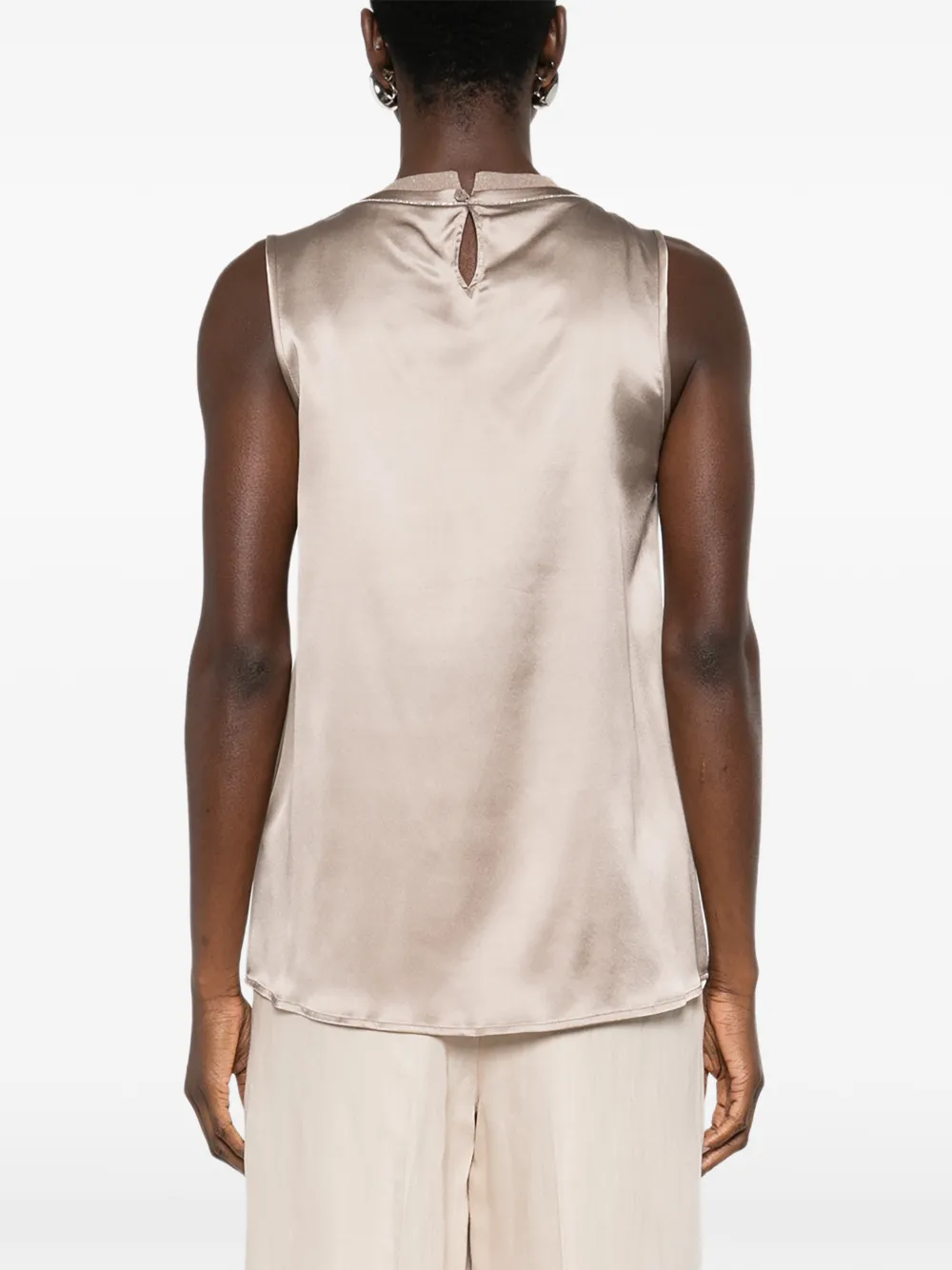 Глиняно-коричневая шелковая безрукавка с круглым вырезом, деталями-каплями и тонкой отделкой