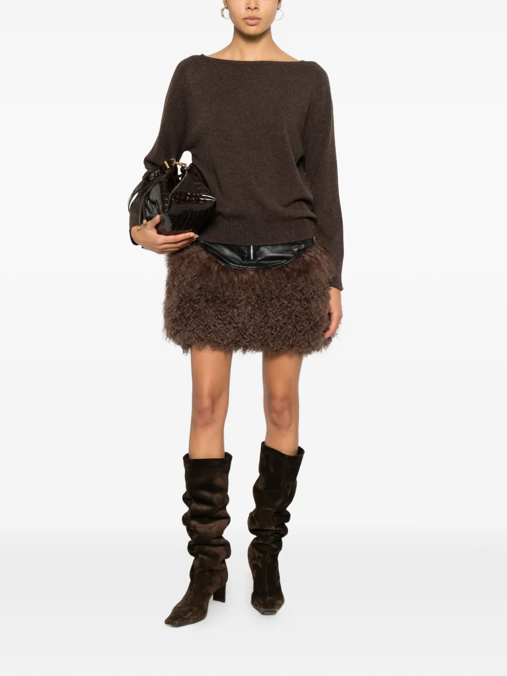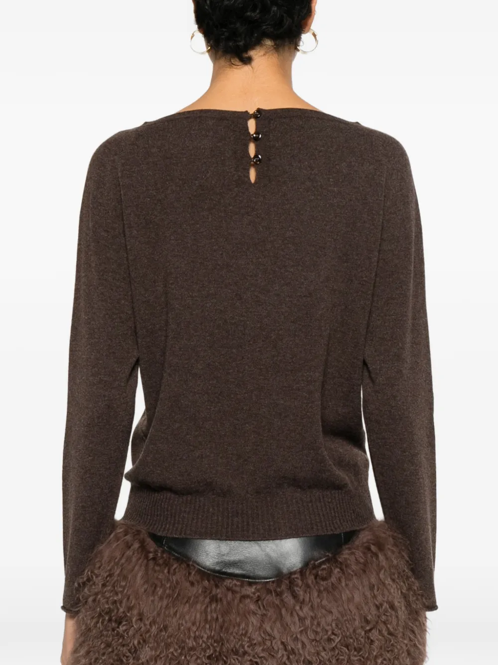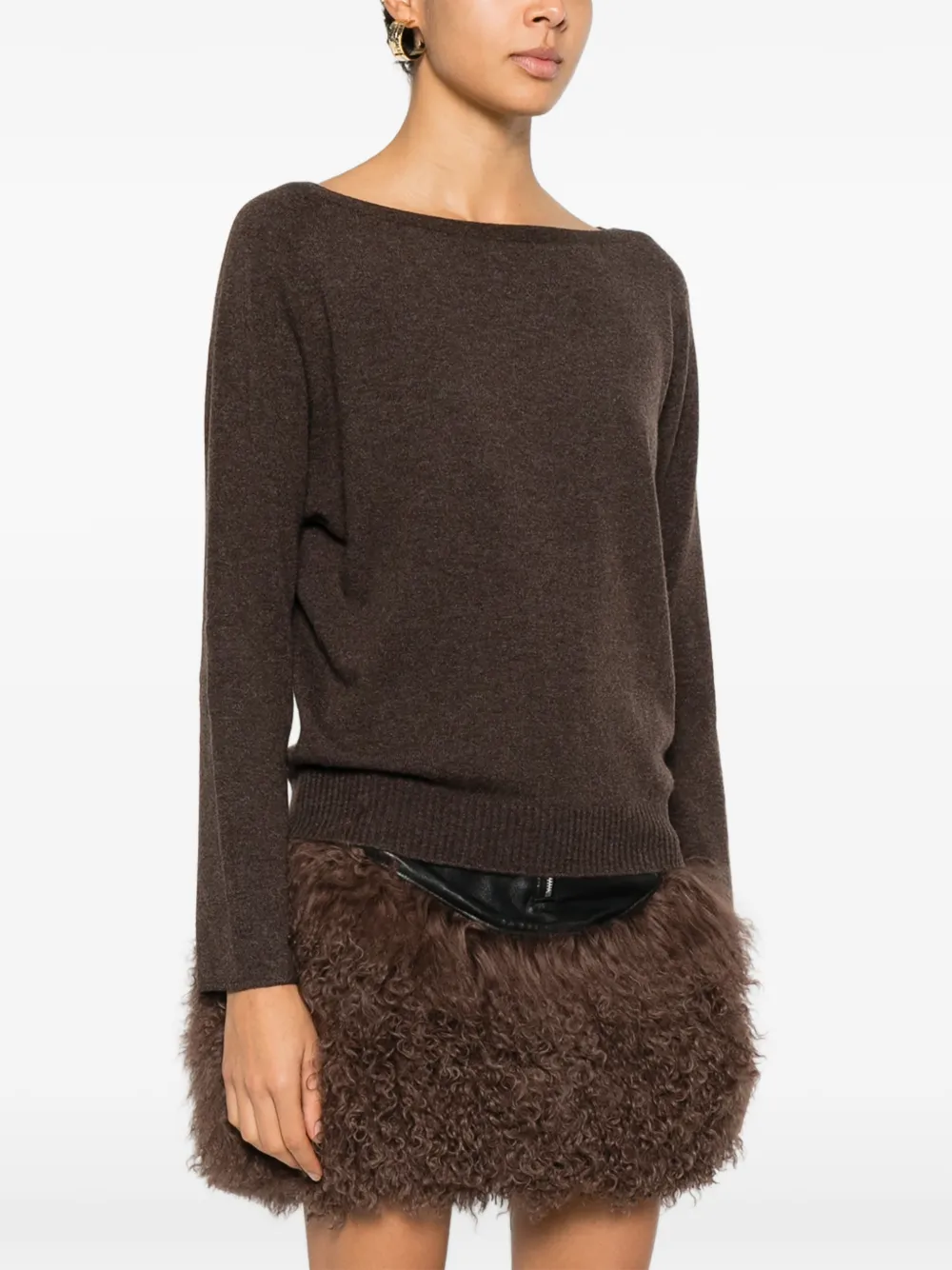 Коричневый тонкий трикотаж с длинными рукавами и вырезом лодочка