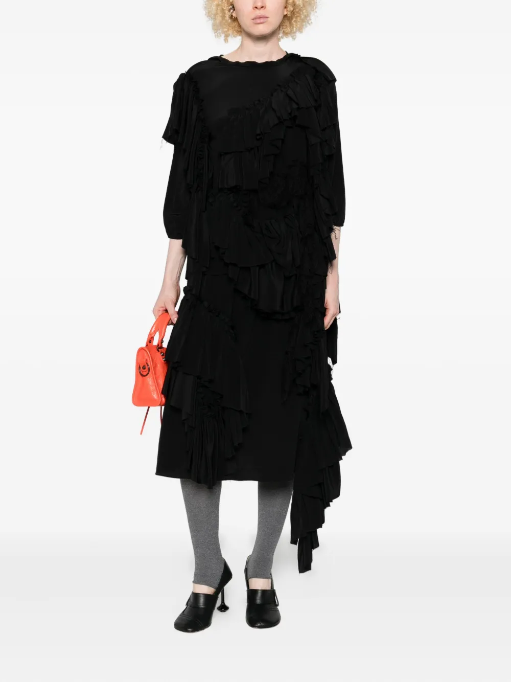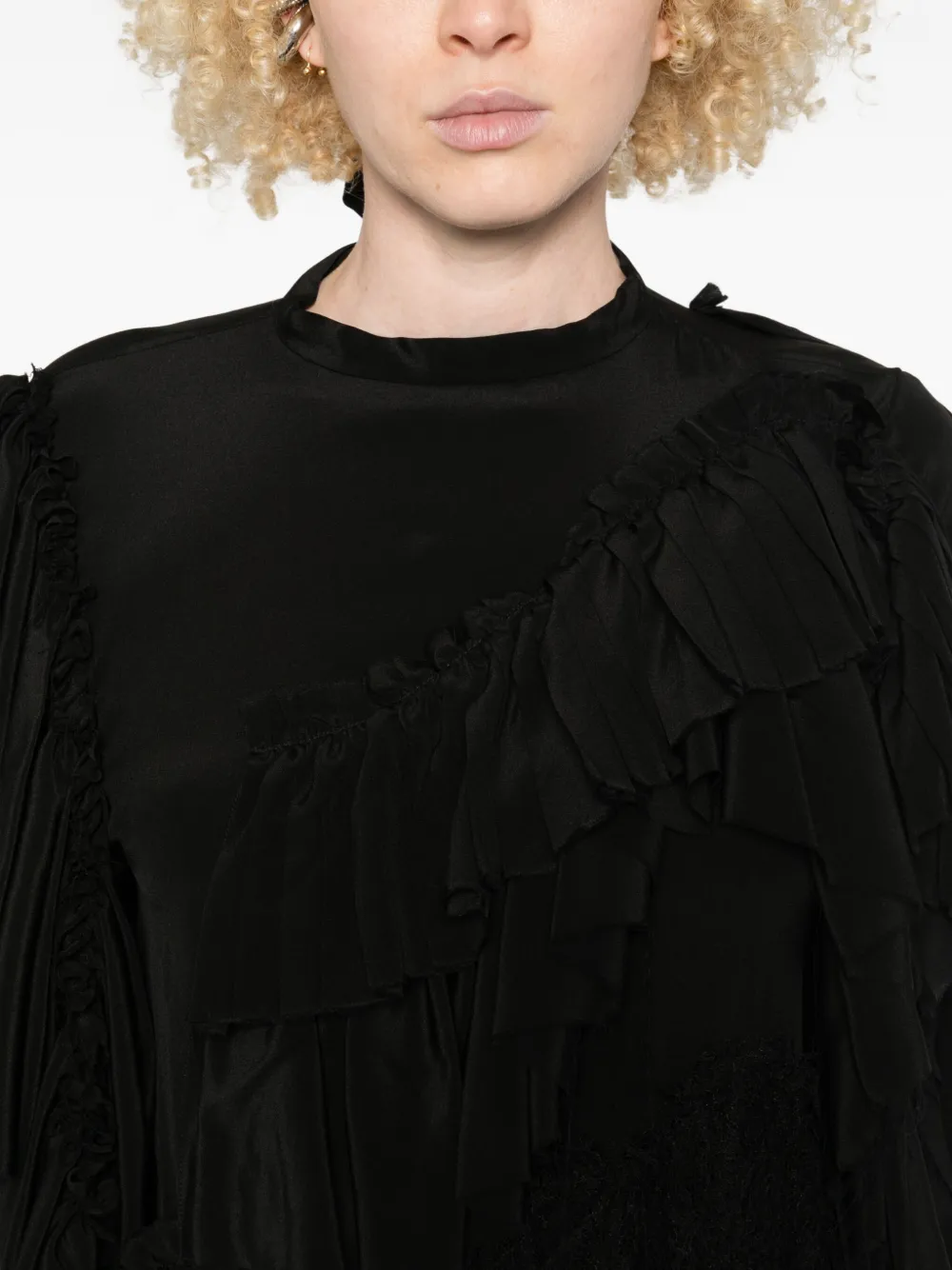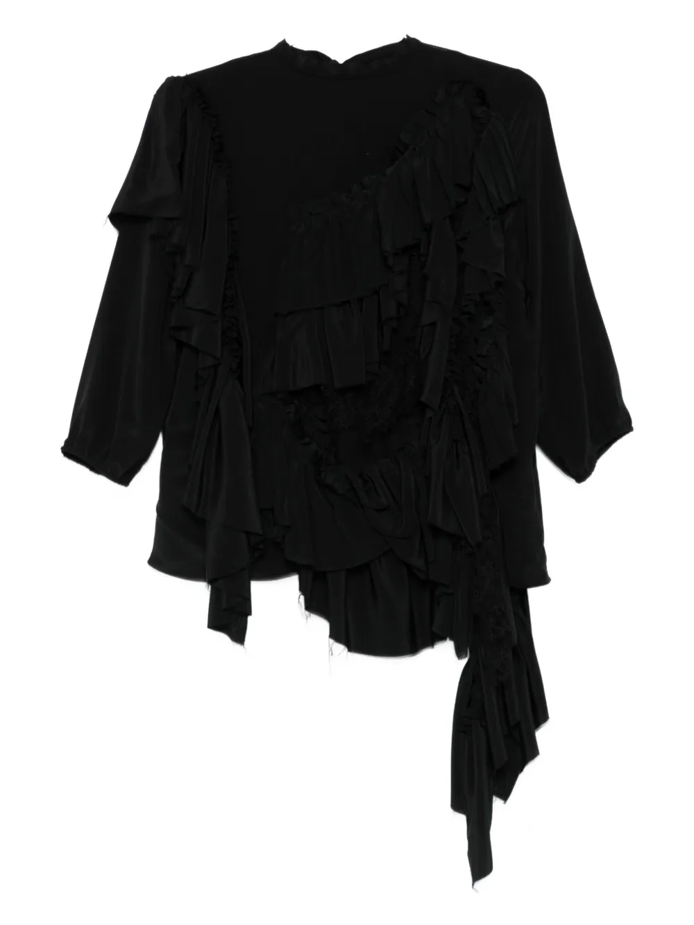 Черные оборки, асимметричный подол, круглый вырез, рукава три четверти, необработанные края