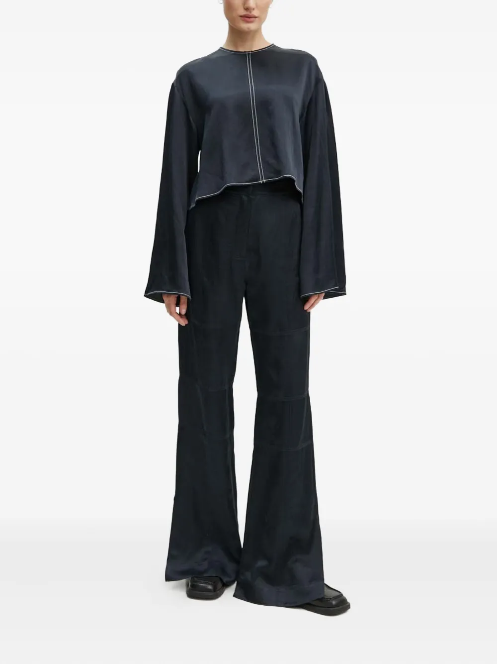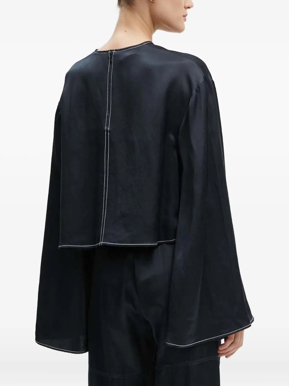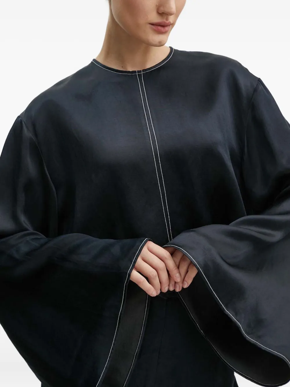 Черный топ с контрастной строчкой, круглым вырезом, длинными рукавами и прямым подолом