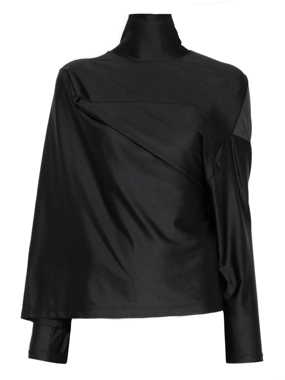 Черный топ с высоким воротником, драпировкой и длинными рукавами