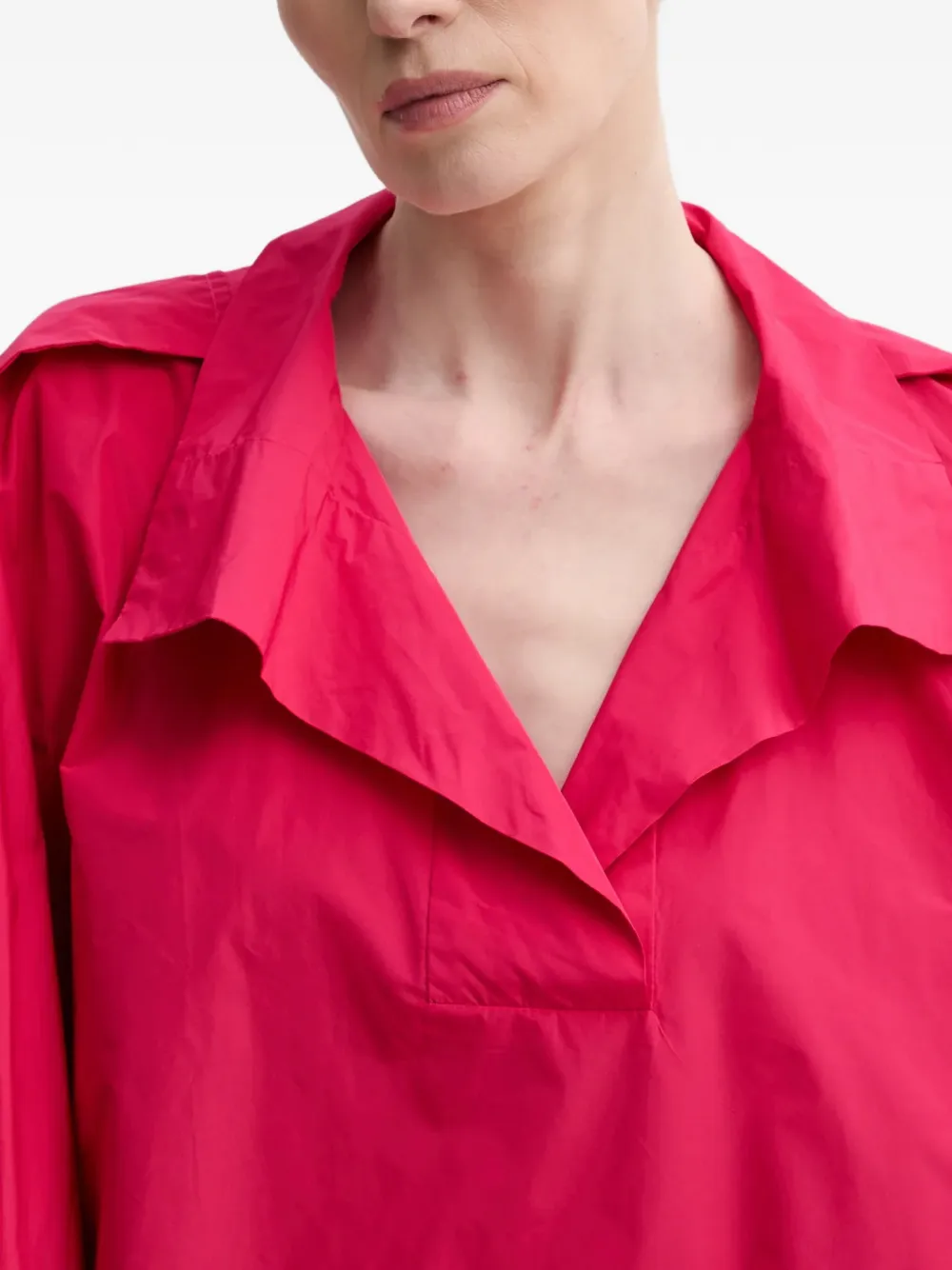 Малиново‑розовый V-образный вырез, рукава «фонарики», собранные манжеты, погоны на плечах