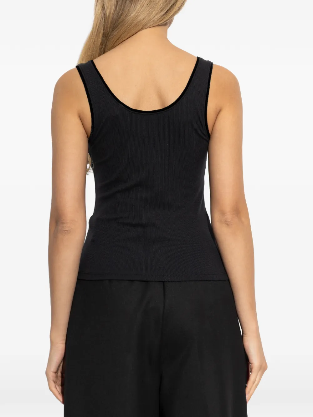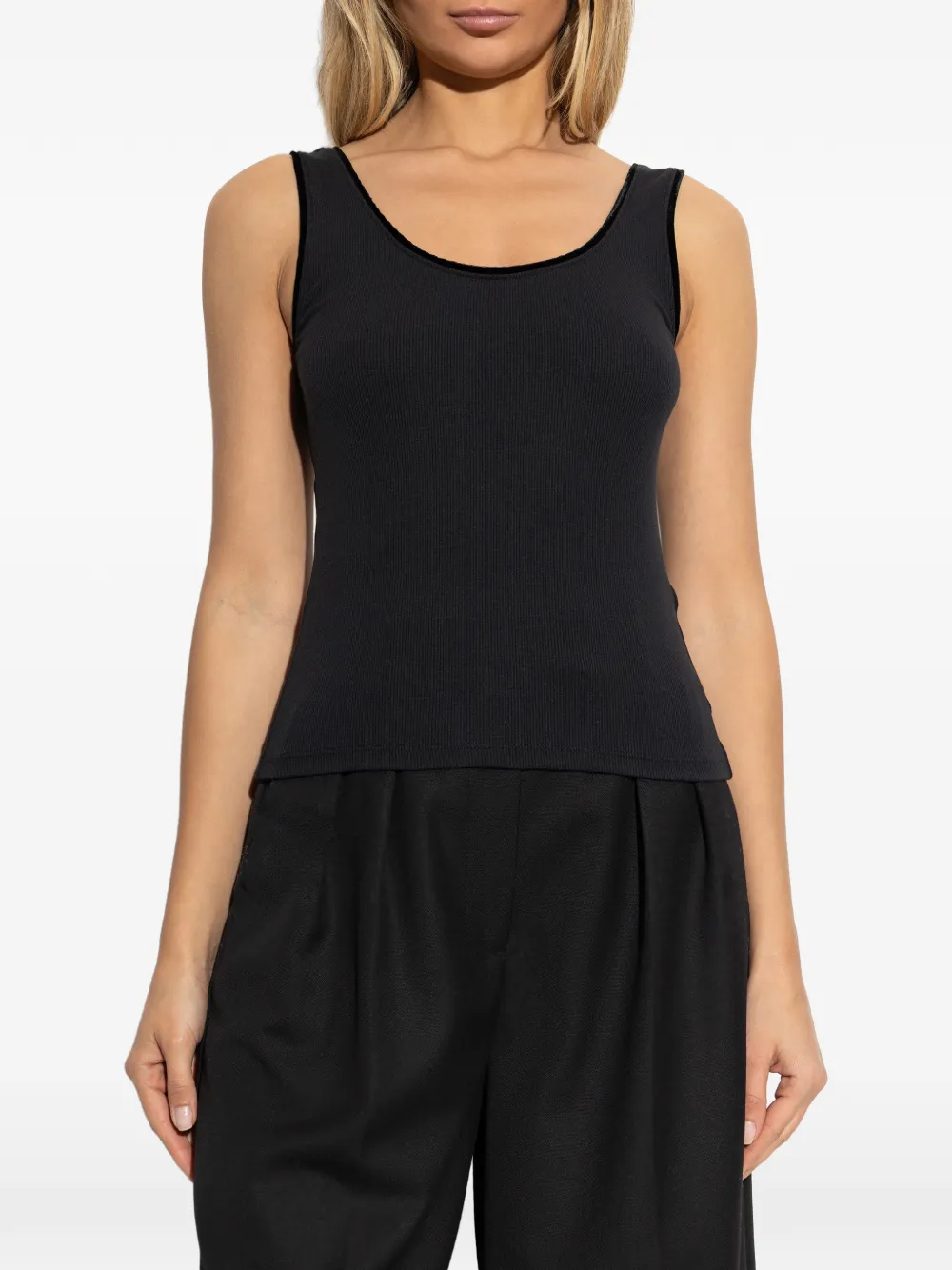 Черный вязаный топ в рубчик с бархатной отделкой, круглым вырезом и без рукавов