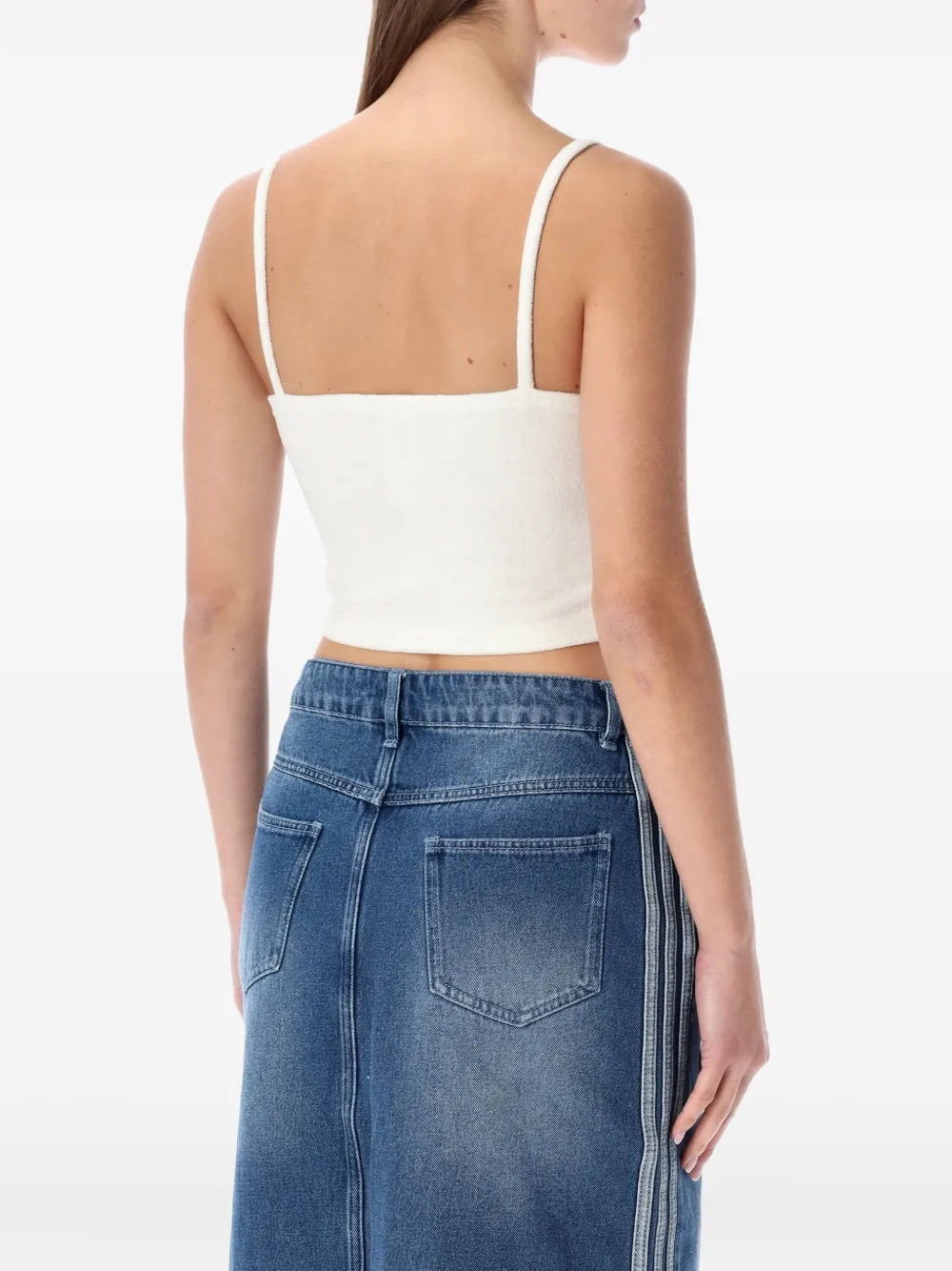 Белый топ с деталями логотипа, полосками, тонкими бретелями, укороченным кроем и квадратным вырезом
