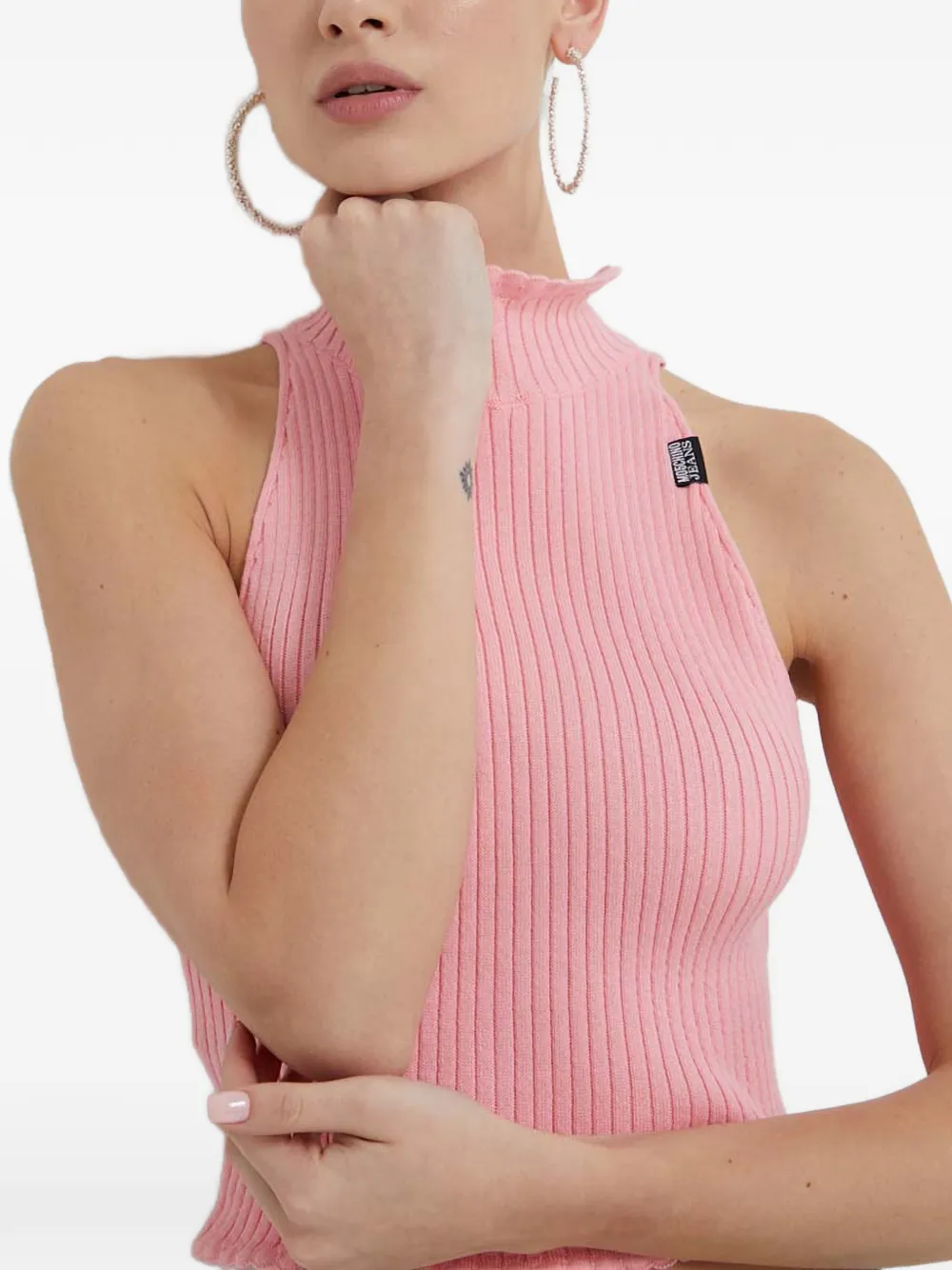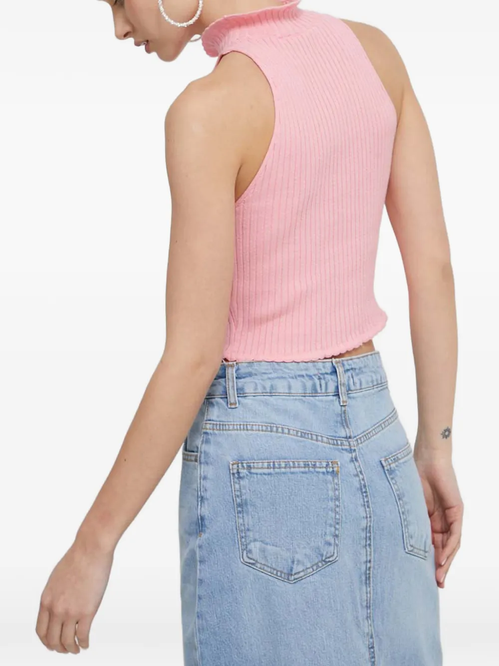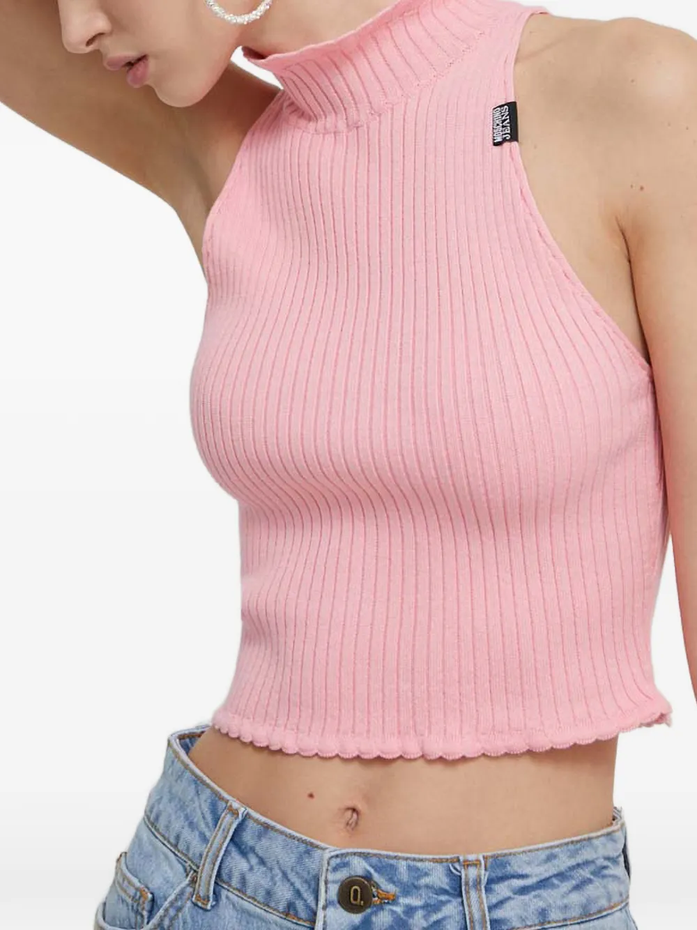 Розовый вязаный топ в рубчик с оборками, высоким воротником, без рукавов, фигурным краем и нашивкой с логотипом