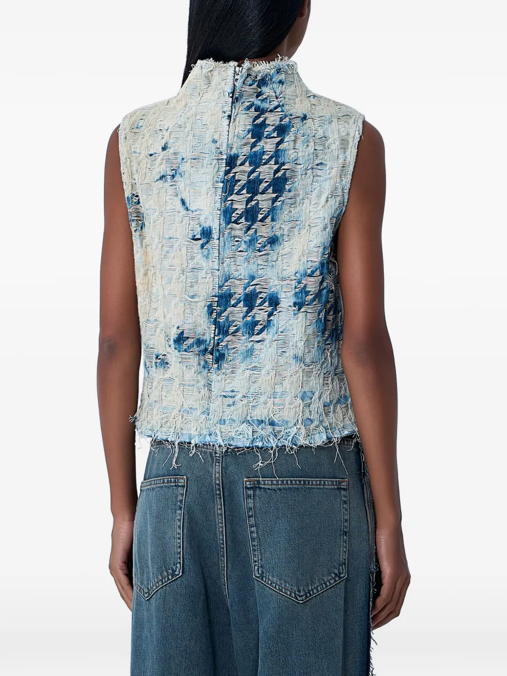 Синий с принтом, стойка-воротник, застежка-молния сзади, эффект потертости, бахромчатый край