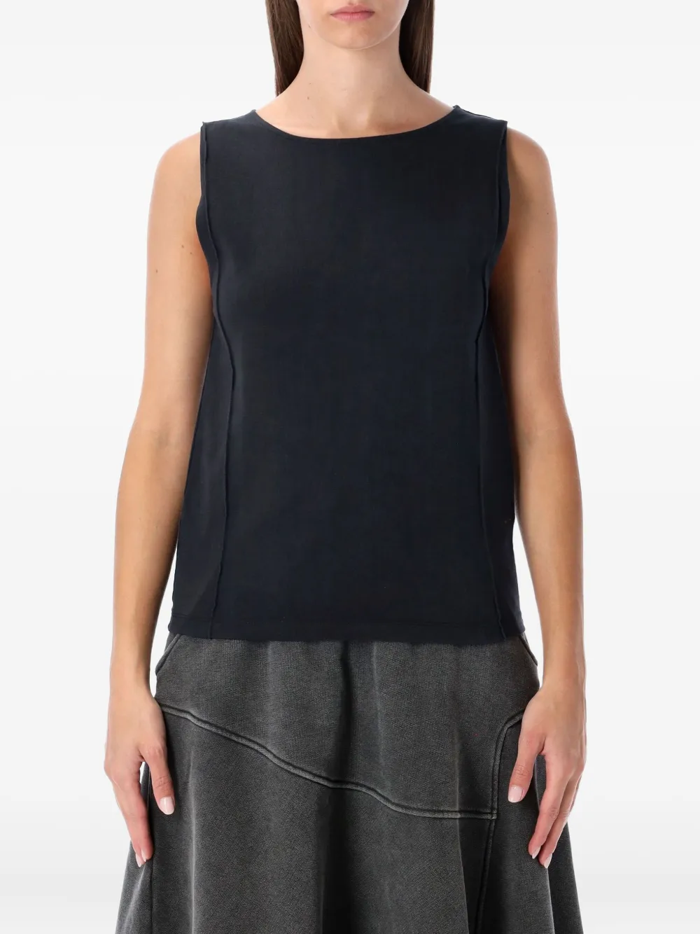 Черный топ без рукавов с круглым вырезом, открытой спиной, необработанным краем и панельной конструкцией