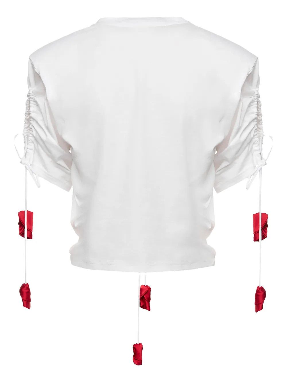 Белая футболка с короткими рукавами, шнурком спереди, приталенным кроем, украшениями в виде роз и сборками