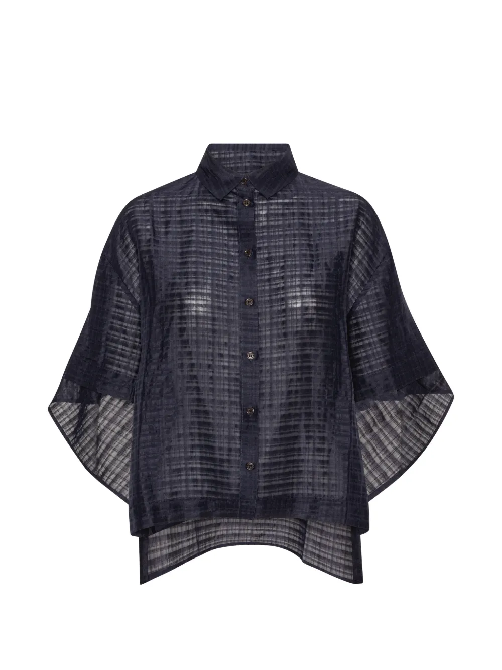 Темно-синий с клетчатым узором, отложной воротник, застежка на пуговицы, рукава три четверти, многослойный дизайн