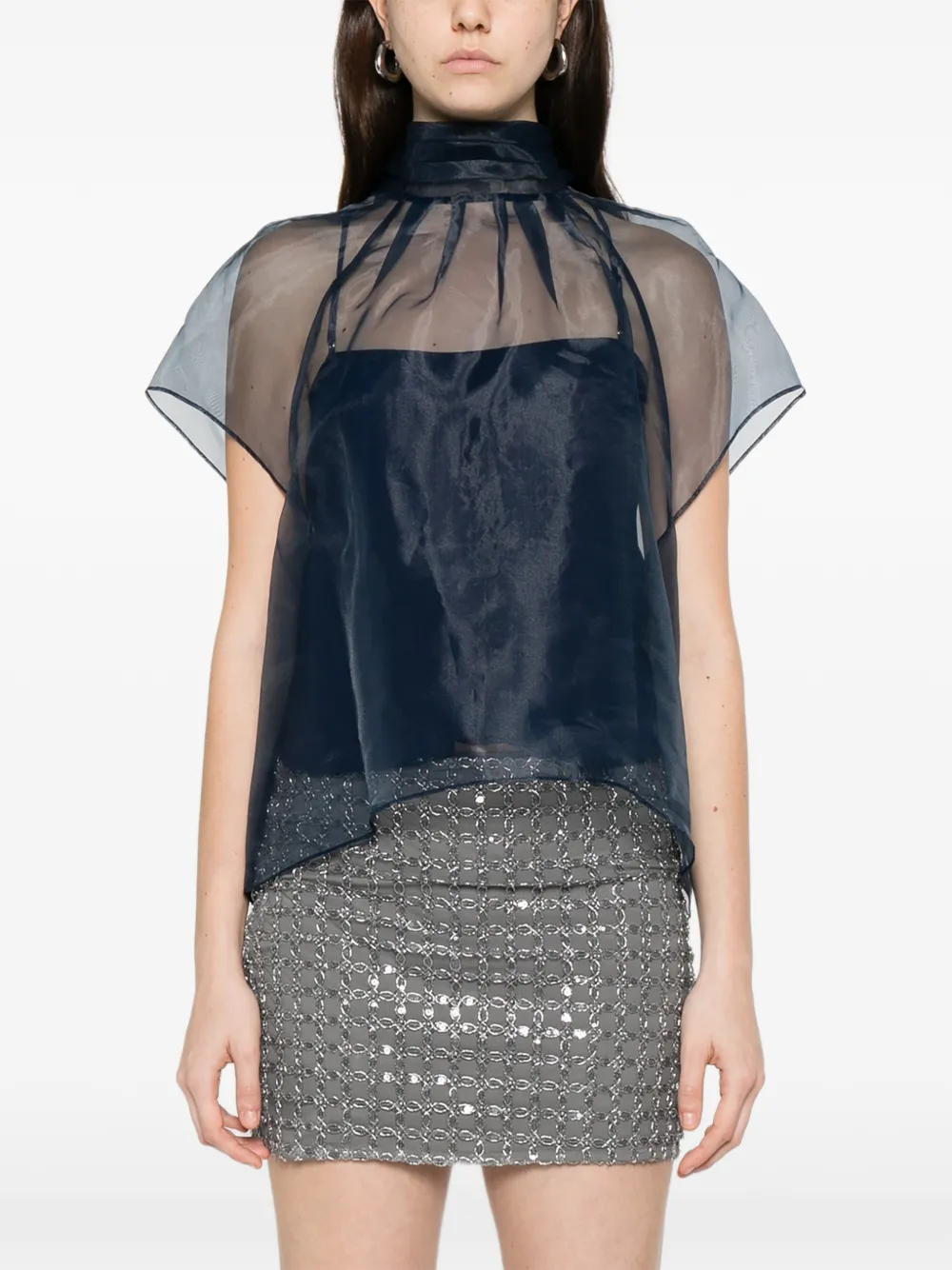 Полупрозрачная отделка полуночного синего цвета, воротник-стойка, детали в виде ленты, короткие рукава, однотонная строчка