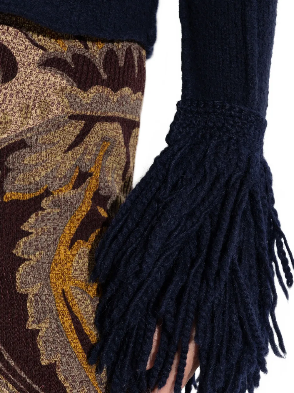 Темно-синий вязаный в рубчик длинные рукава отделка бахромой на манжетах застежка на пуговицы сзади смесь шерсти