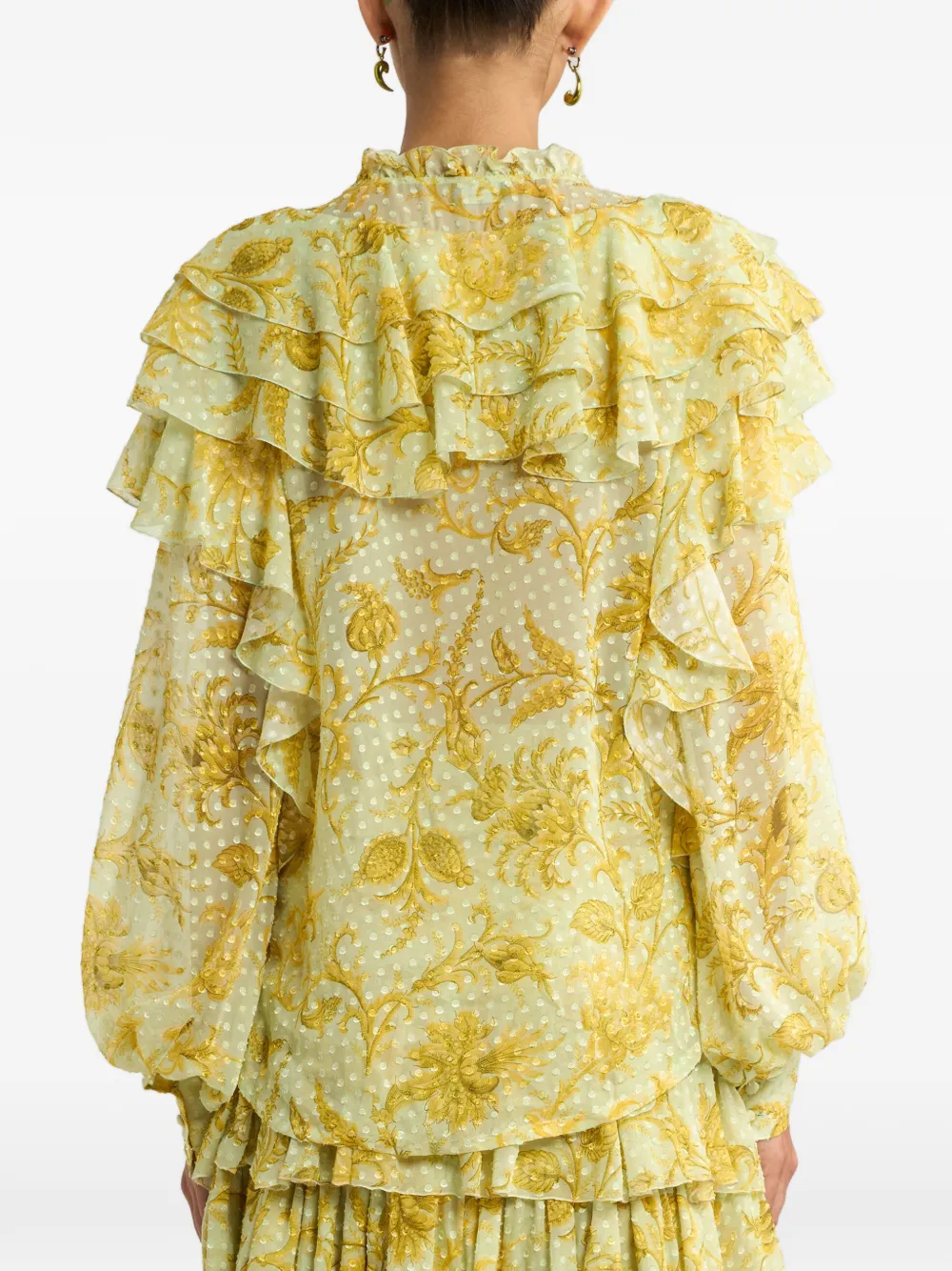 Желтый цветочный принт, эффект в горошек, оборчатая отделка, присборенные манжеты, завязывающаяся застежка