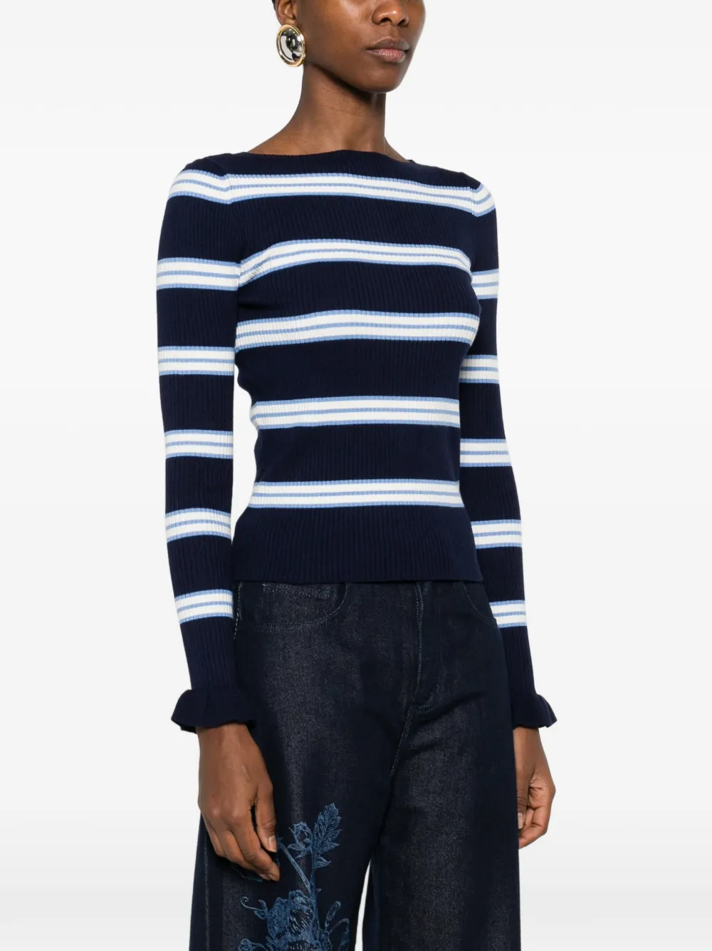 Синий в полоску трикотаж в рубчик с вырезом лодочка, длинными рукавами и оборками на манжетах