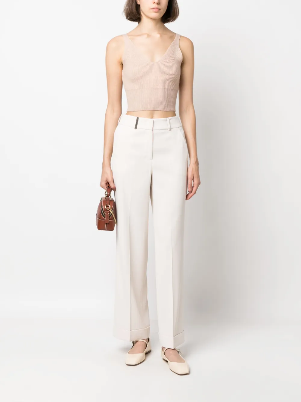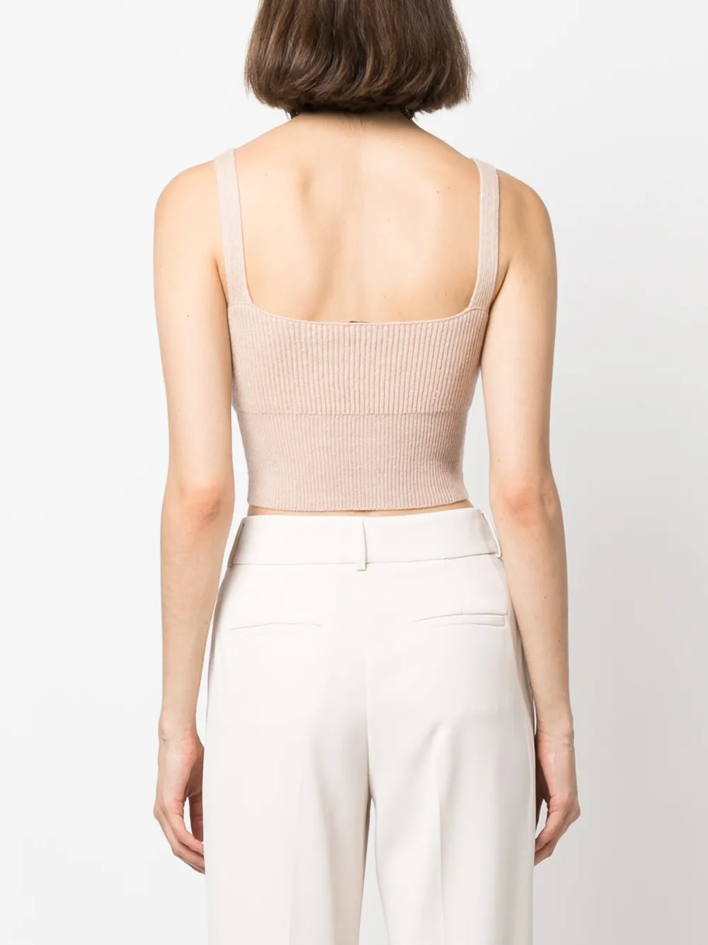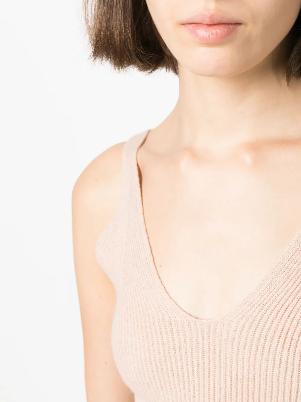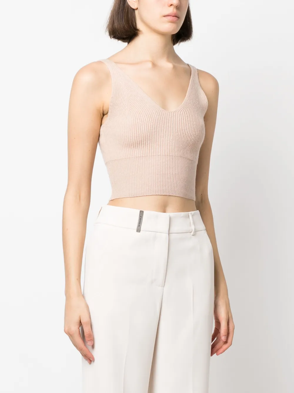 Бежевый, смесь шерсти и кашемира, трикотаж в рубчик, U-образный вырез, без рукавов, укороченная длина и прямой подол.