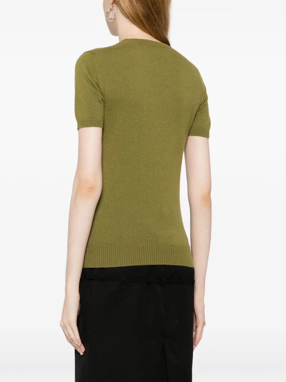 Хаки, кашемир, логотип в технике интарсия, круглый вырез, короткие рукава, отделка в рубчик и прямой подол.
