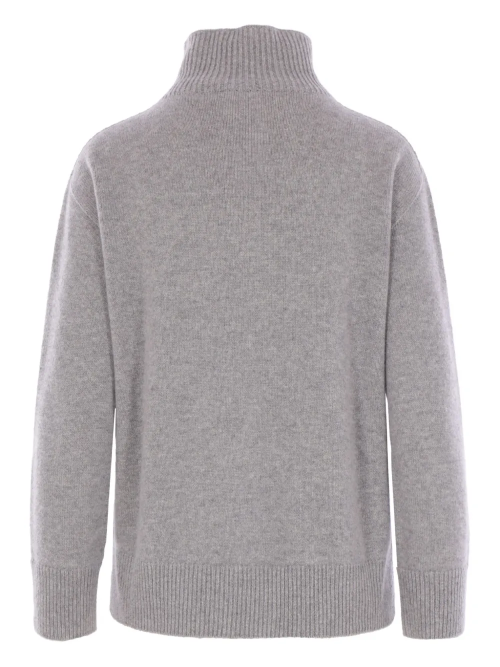 Светло-серый свитер с воротником-стойкой, вязаной фактурой и ребристыми манжетами и подолом