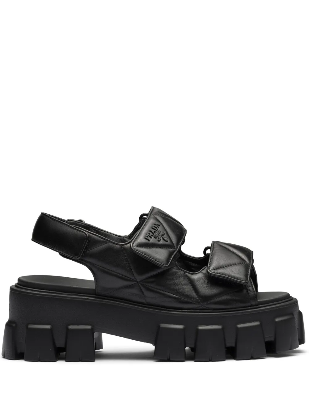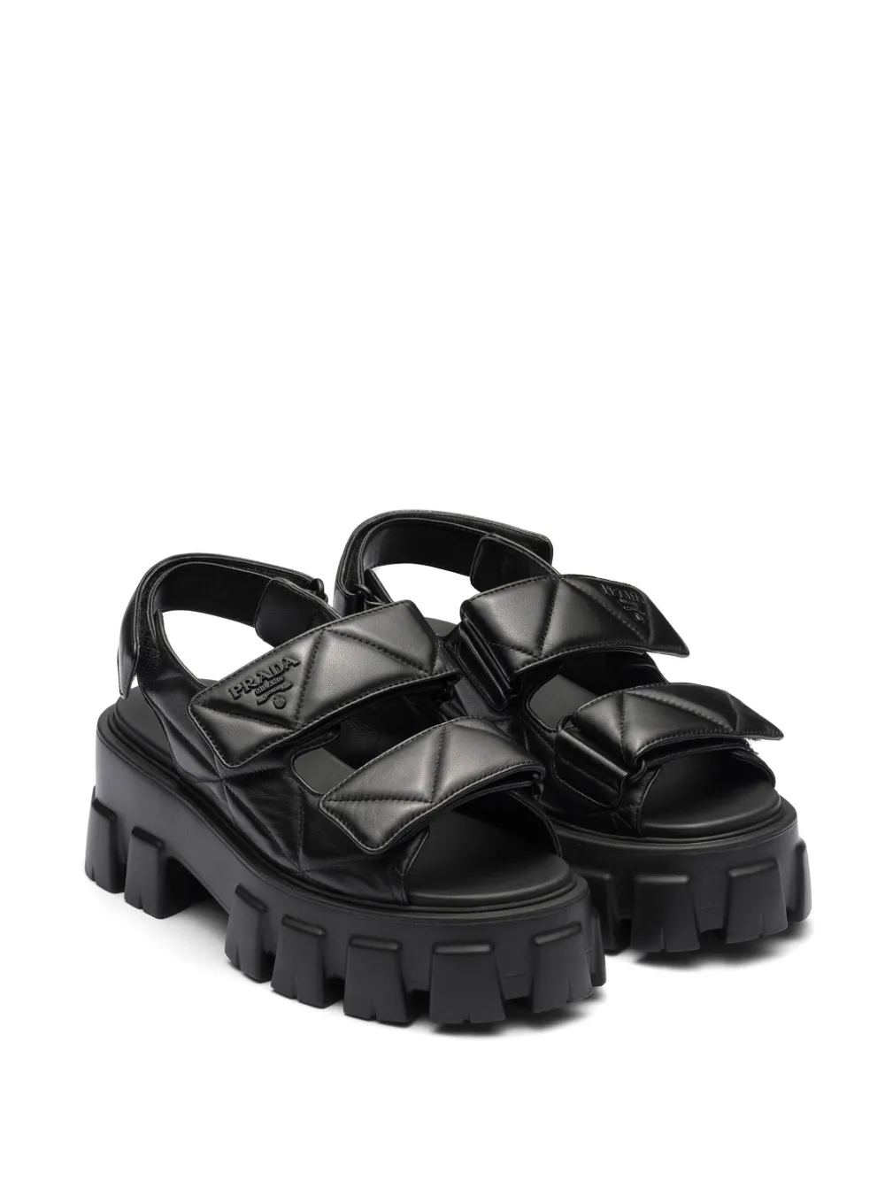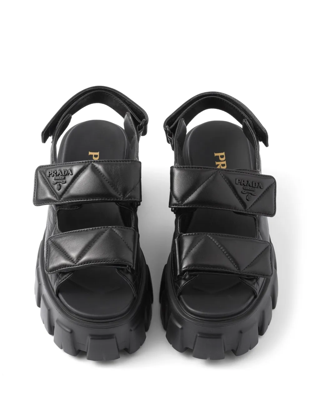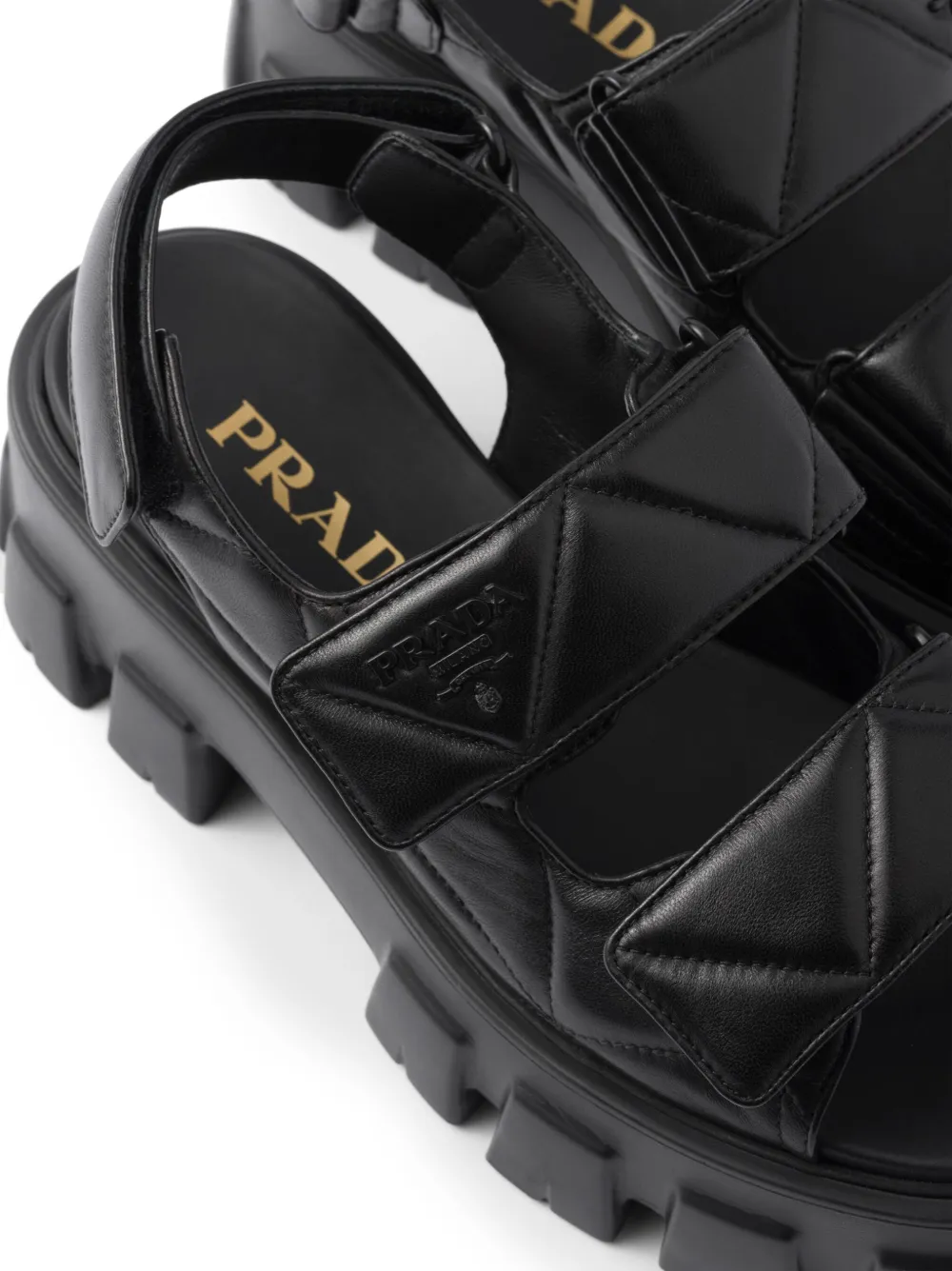 Черный, кожа наппа, стеганая модель, треугольный логотип, стелька с логотипом, застежка на липучке, застежка на липучке и массивная резиновая подошва.