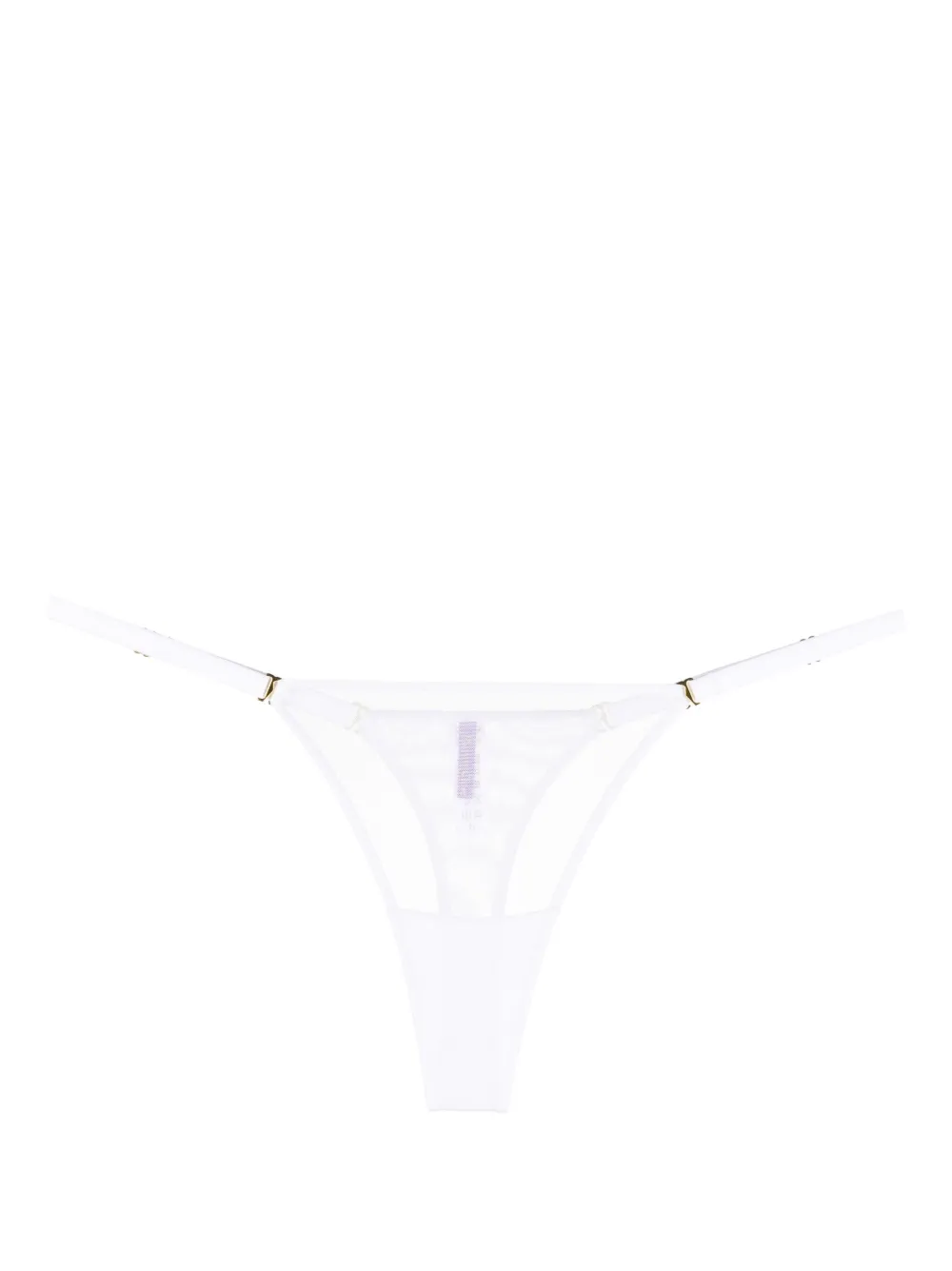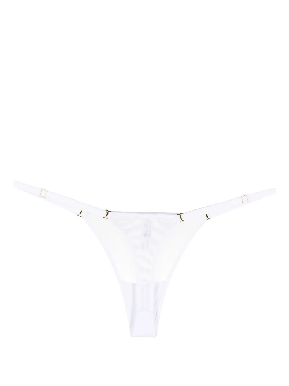 Белый, эластичный материал, прозрачные вставки, низкая посадка, Т-образный ремешок и регулируемый дизайн. Эту вещь можно примерить, но только поверх собственного белья.