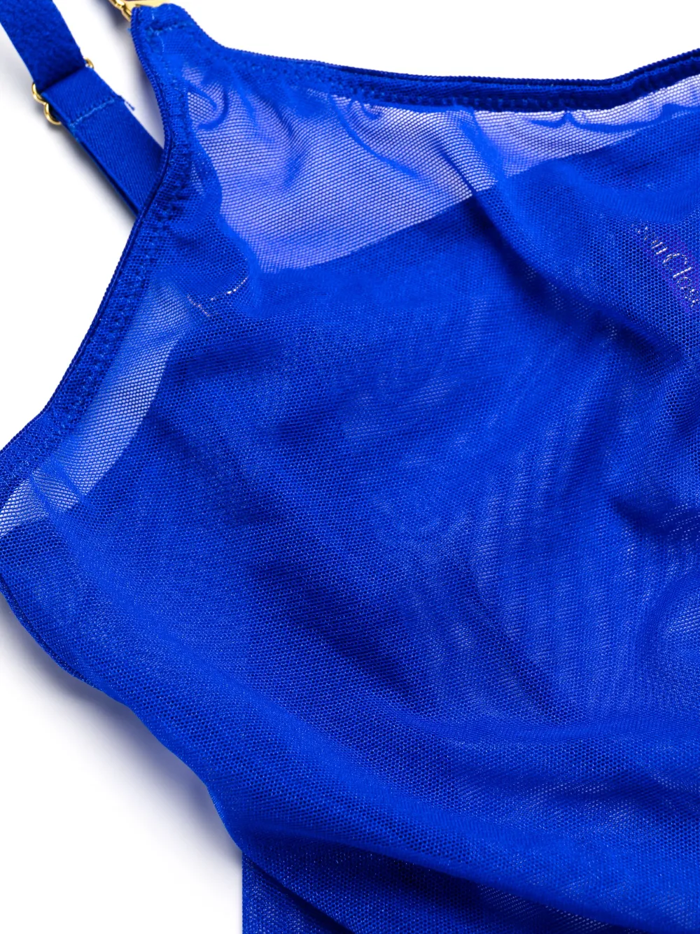 Насыщенно-синий, эластичный материал, прозрачный материал, покрытие с переливающимся эффектом, два ремня на плечо с логотипом, два съемных регулируемых ремня на плечо, завышенная талия и стринги. Эту вещь можно примерить, но только поверх собственного белья.