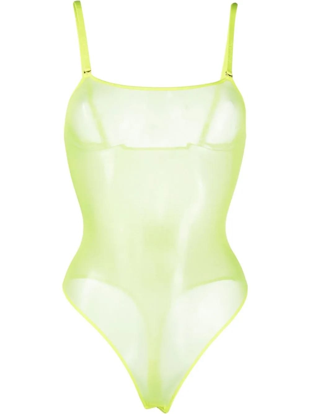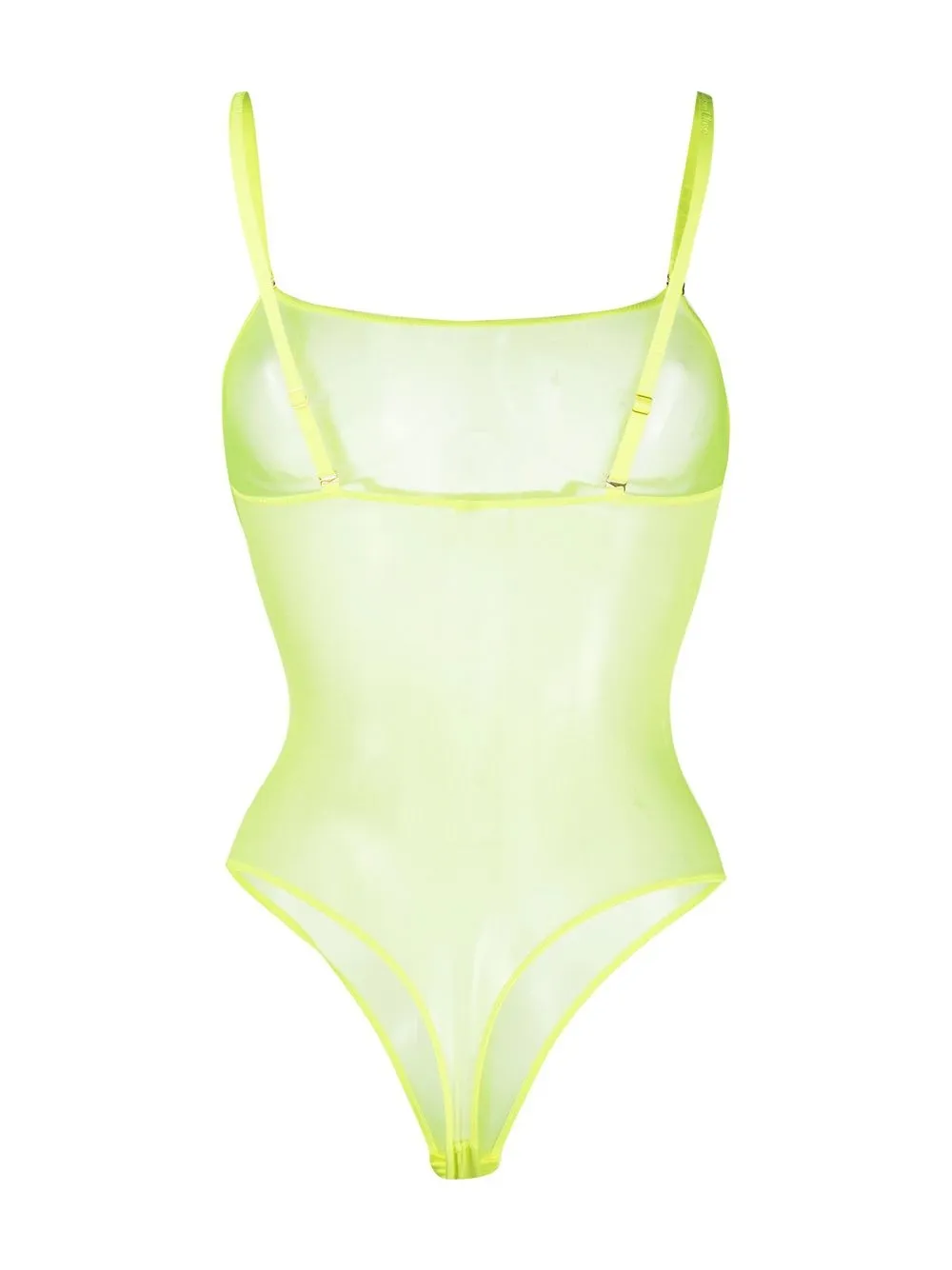 Флуоресцентный желтый, эластичный материал, прозрачное покрытие, два съемных ремня на плечо, квадратный вырез и Т-образный ремешок. Эту вещь можно примерить, но только поверх собственного белья.