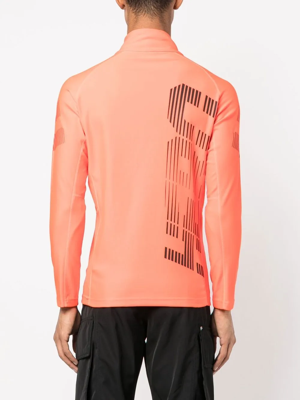 Оранжевый, принт с логотипом на груди, принт с надписью сзади, полоски, застежка на молнии спереди и длинные рукава.