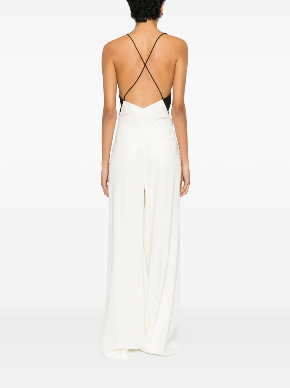 Белый с черной контрастной отделкой, тонкие бретели, широкий низ брюк, скрытая застежка-молния сзади