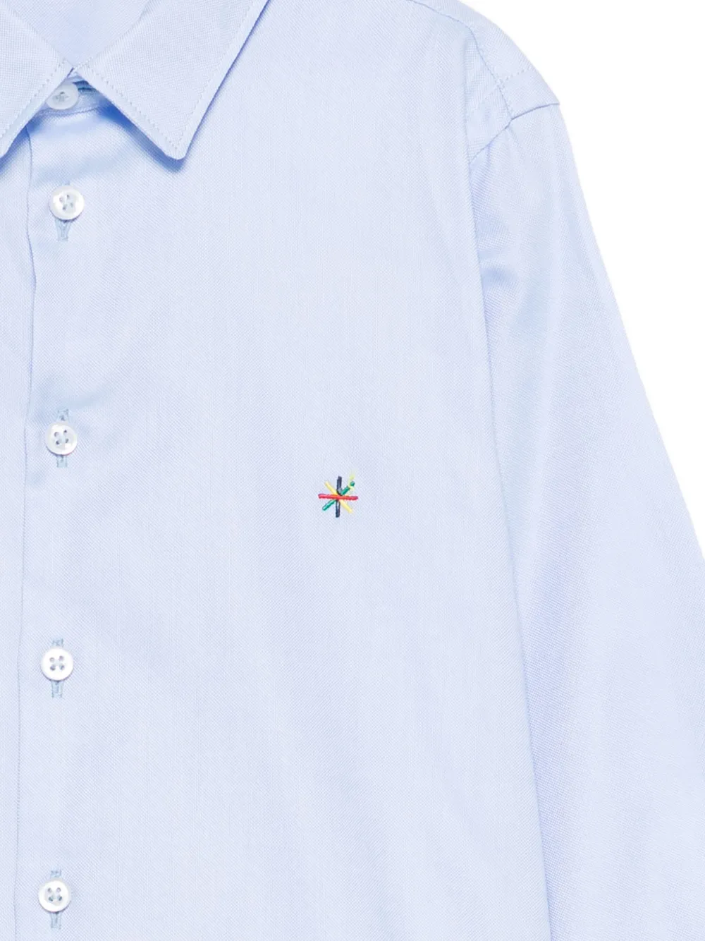 Светло-голубая рубашка с вышивкой, застежкой на пуговицы, длинными рукавами, манжетами на пуговицах и классическим воротником