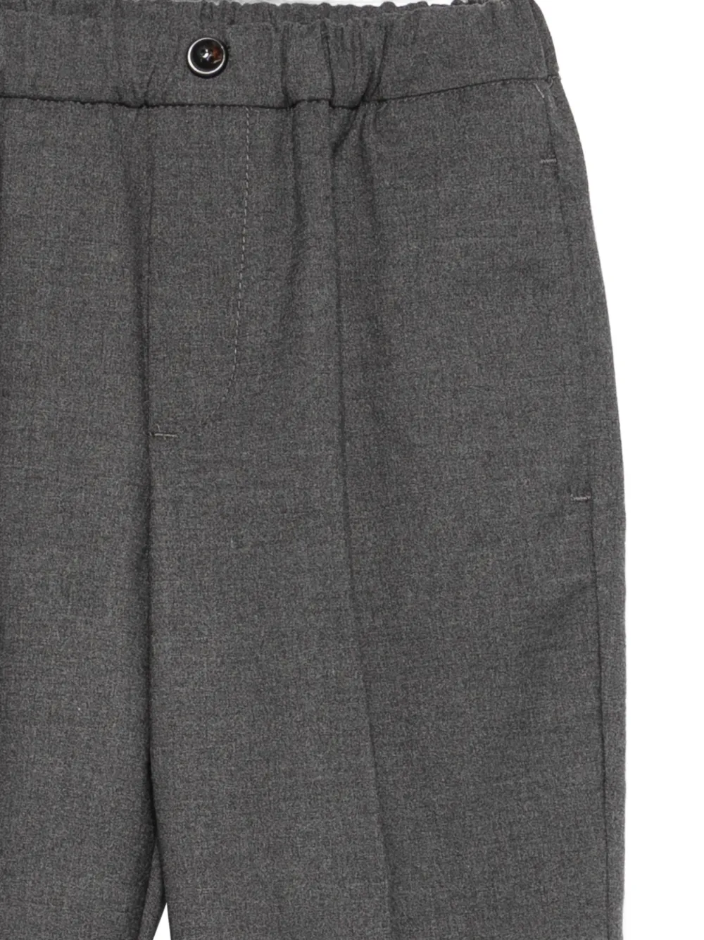 Серый цвет, эластичный пояс, застежка на пуговицах, боковые карманы в шве, задние прорезные карманы